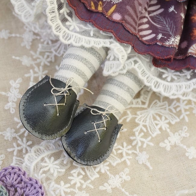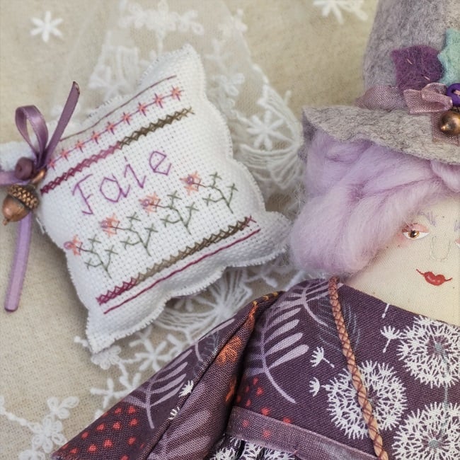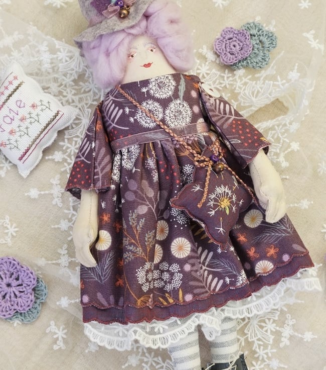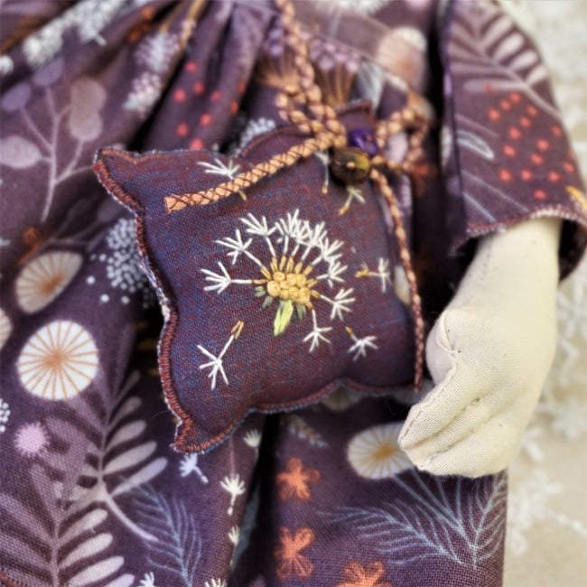 A special order for a lovely lady, with dandelion and honesty seed from her garden to her stuffing and an amethyst to her heart. She is dressed in Fairy Clocks, a truly beautiful fabric by Lewis and Irene, just released. She has a silver grey hat and silver grey leather shoes with tiny buttons and pink ribbon. She is accented with bronze acorn charms.