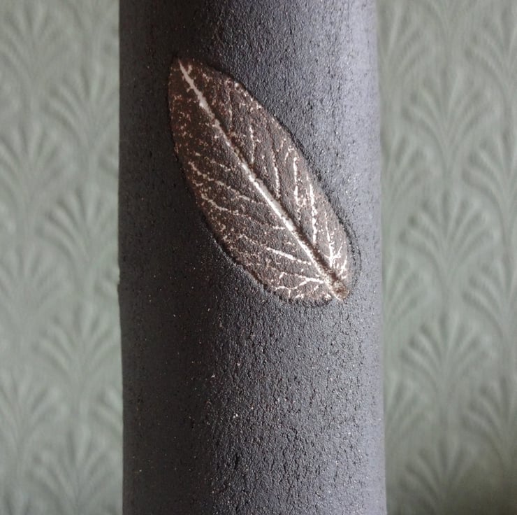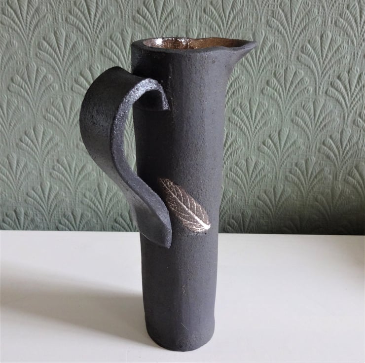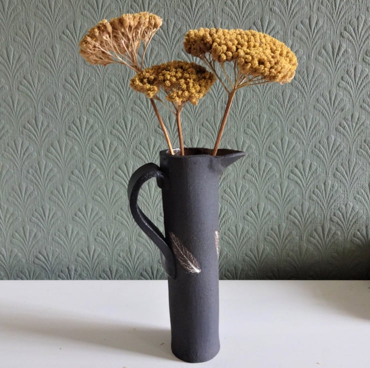 I love to use leaf imprints in clay, and sage leaves are one of my favourites. I made a set of three jugs in black stoneware clay and pressed the sage leaves into the clay, then highlighted with white colour before firing. I fashioned them with big beaky spouts for a modern, cheery look and each jug is slightly different in form and decoration. The insides are glazed in a rusty brown shiny finish so that they can hold water if you want to display a flower or two, or keep some fresh herbs within easy reach in the kitchen. Alternatively, the three jugs can make an eye-catching set when displayed together. The outside of each jug is the natural matt black clay finish, so please note they are NOT intended to hold liquids like milk, cream or juice, they are decorative pieces or little vases. The single jug images in this listing show Stella (14.5 cms high x 4 cms diameter at base), so if you prefer one of the others shown in the group photographs, please see my other listings of Suki and Simon.