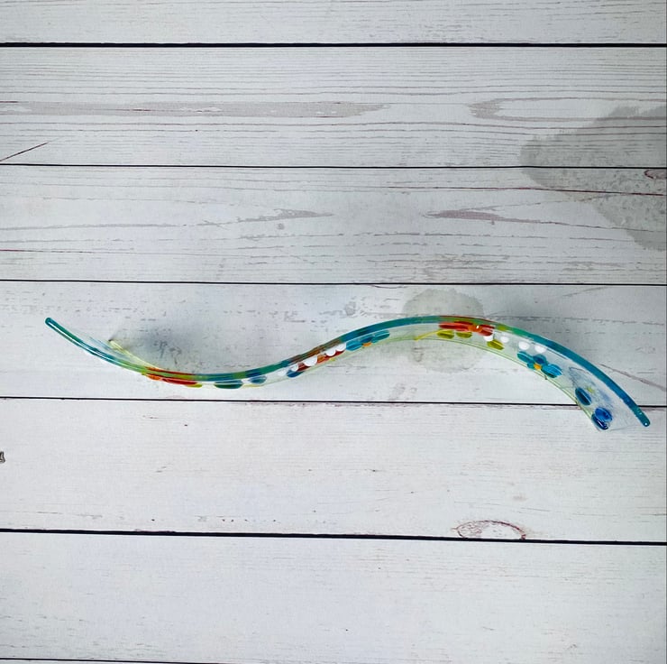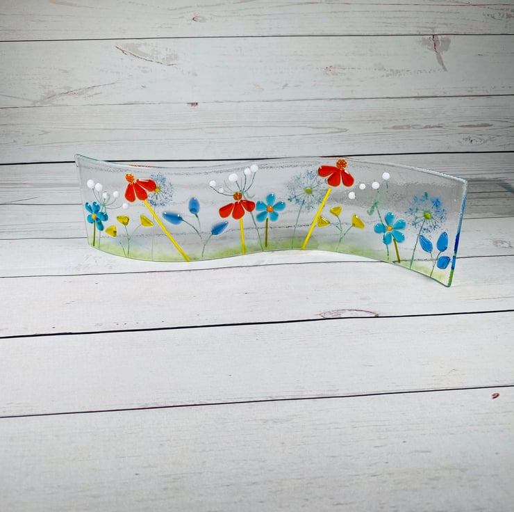 Gorgeous interpretation of summer meadow in glass. Very cheerful and summery . Stands independently on a window sill or shelf and is 12 in long x 3.5 in high .