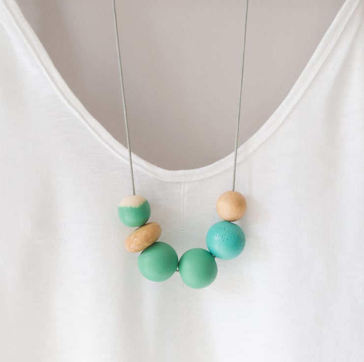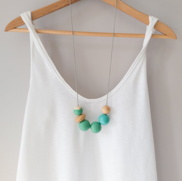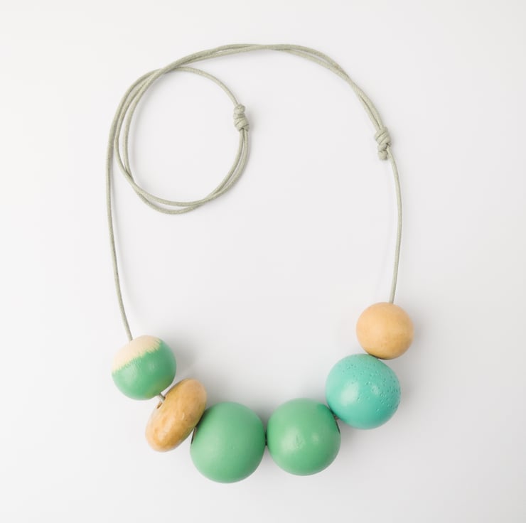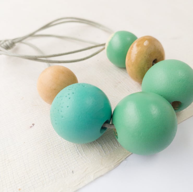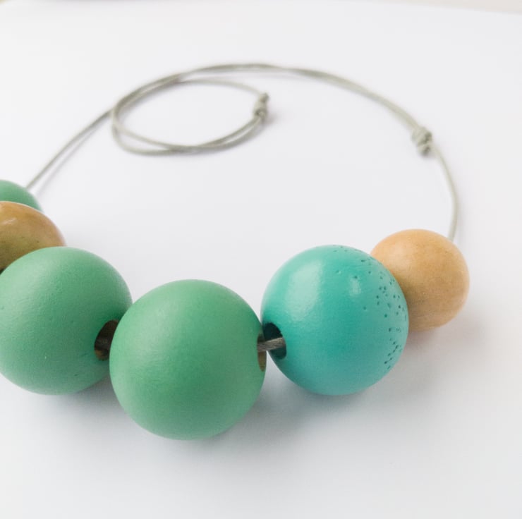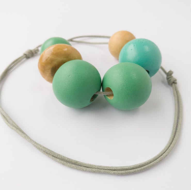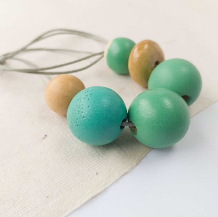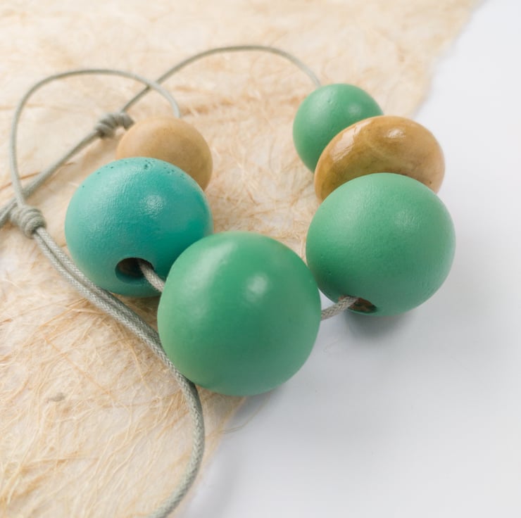 ‘Maggie’ has one lovely large textured turquoise hand painted bead, which combines well with the fresh spring green and natural wood colours, it's light and easy to wear.