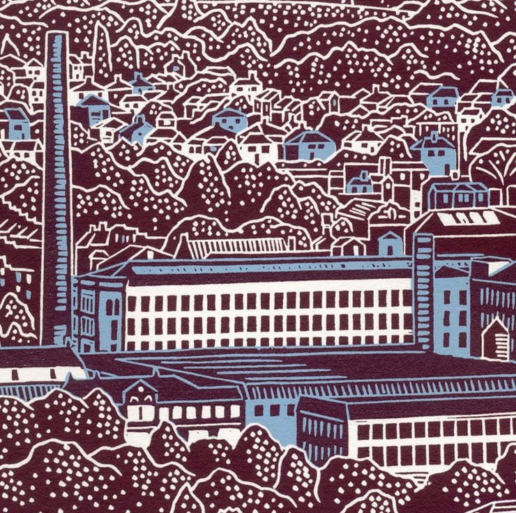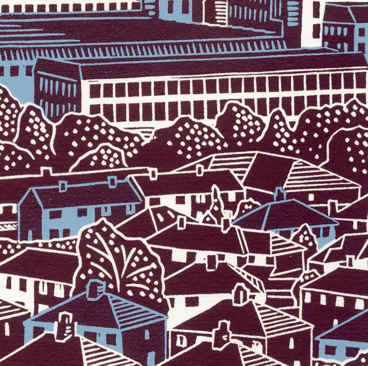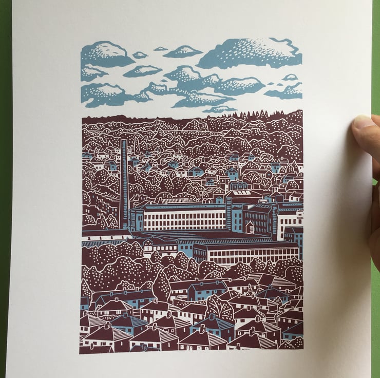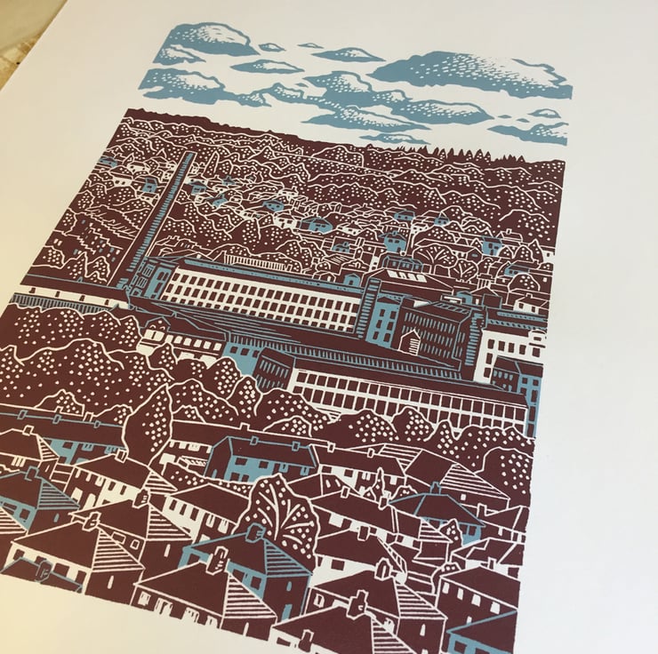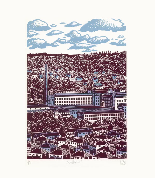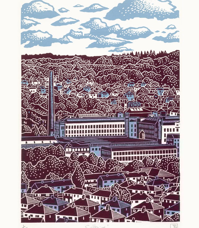 A3 (29.7cm x 42 cm) 2-colour linocut / screen-print entitled 'Saltaire'.