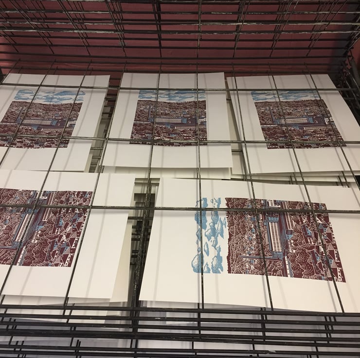 Maroon and light blue System 3 inks on off-white 250gsm acid-free paper. From an edition of 65, signed, titled and numbered. I created the image initially as a linocut print, and then transferred the image to a silk-screen to hand-print the edition.