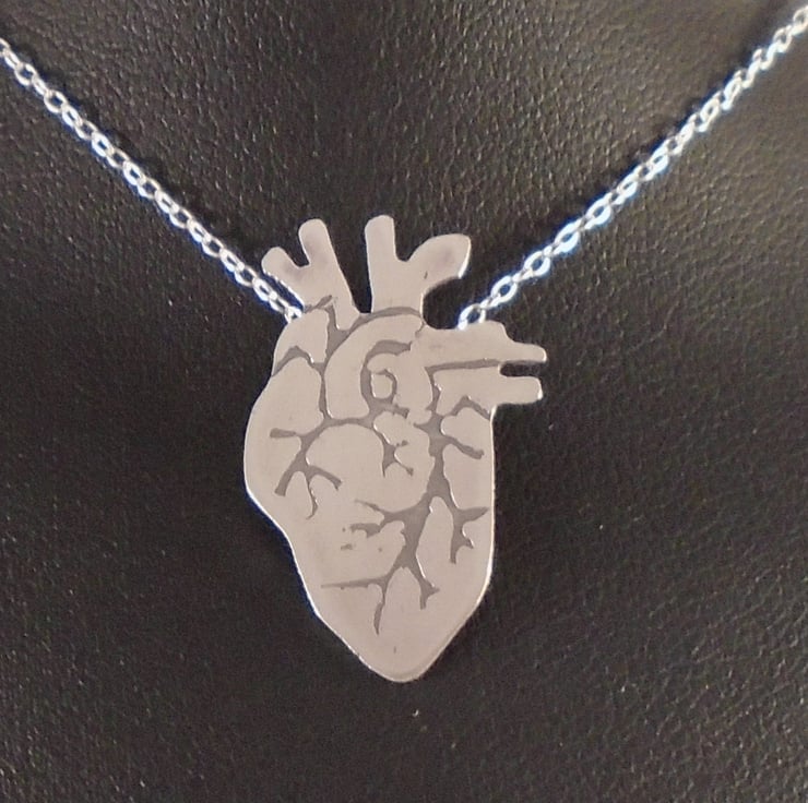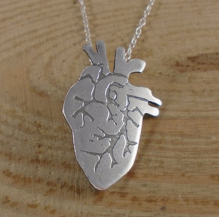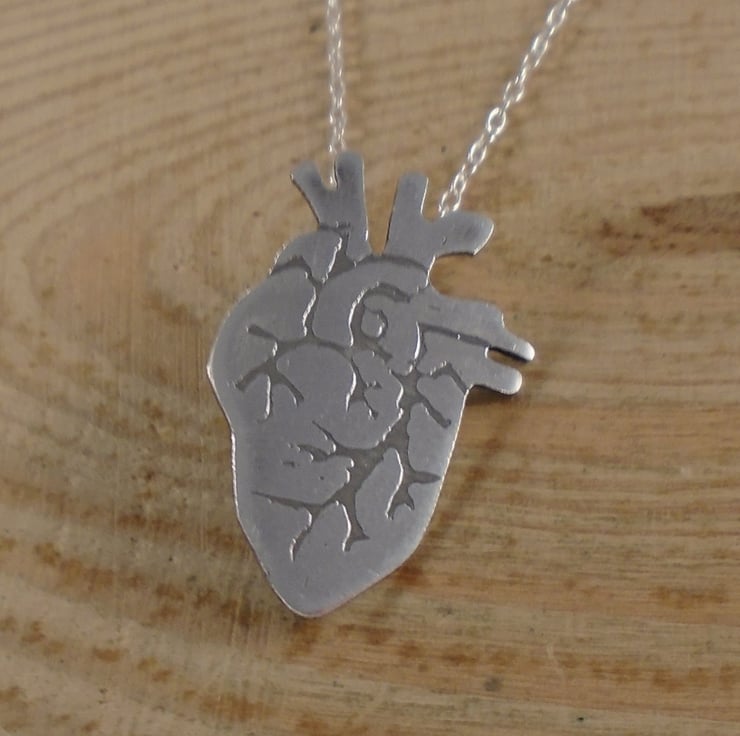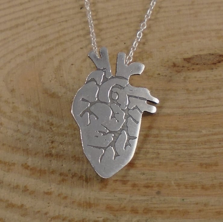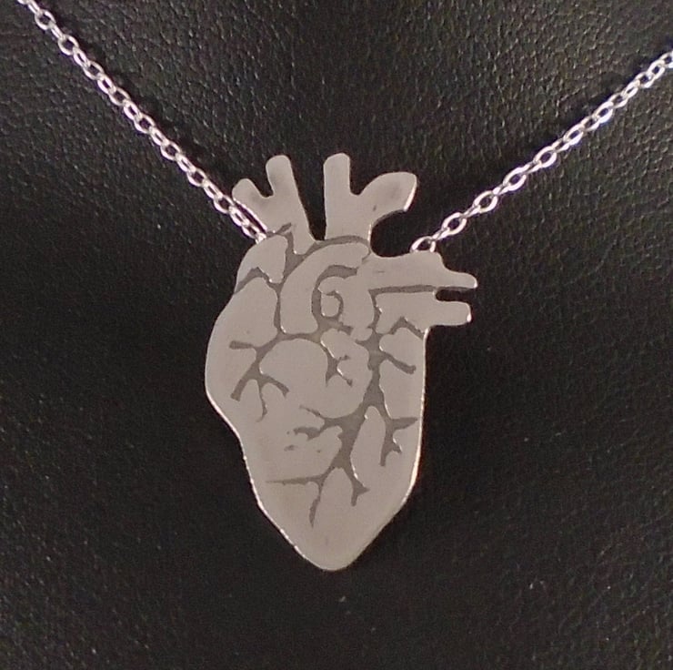 A quirky heart necklace, hand made from sterling silver. The shape of the heart has been hand pierced from a sheet of sterling silver. The details have then been hand drawn and etched. A loop has then been soldered to the back for the chain, and the necklace has been oxidised to blacken the etched details.
