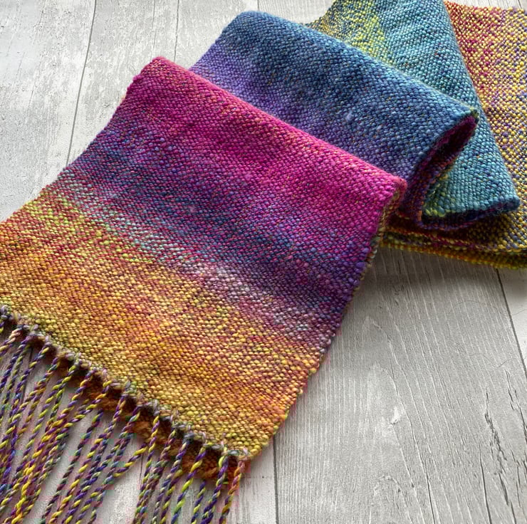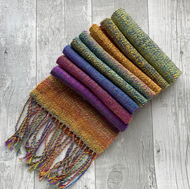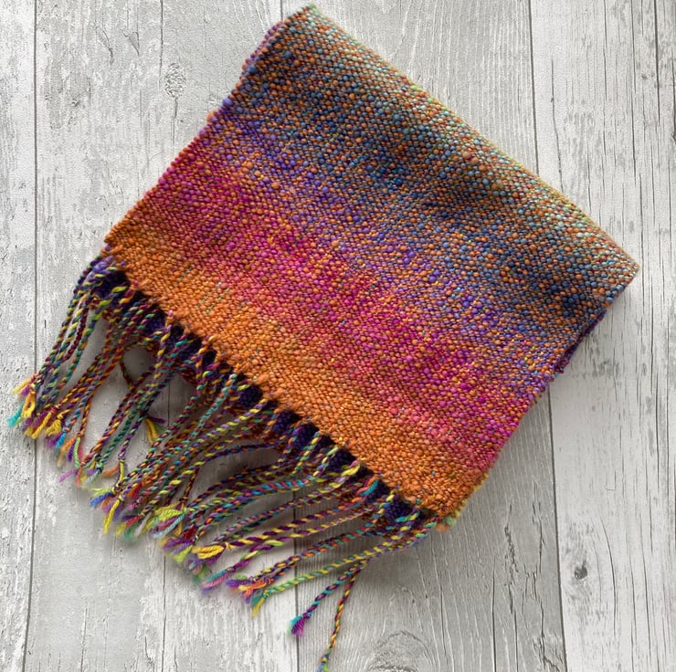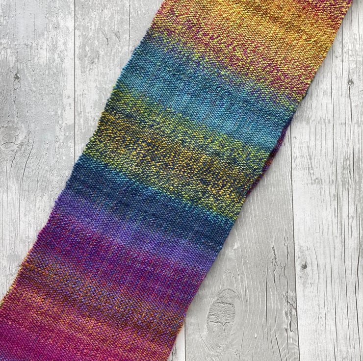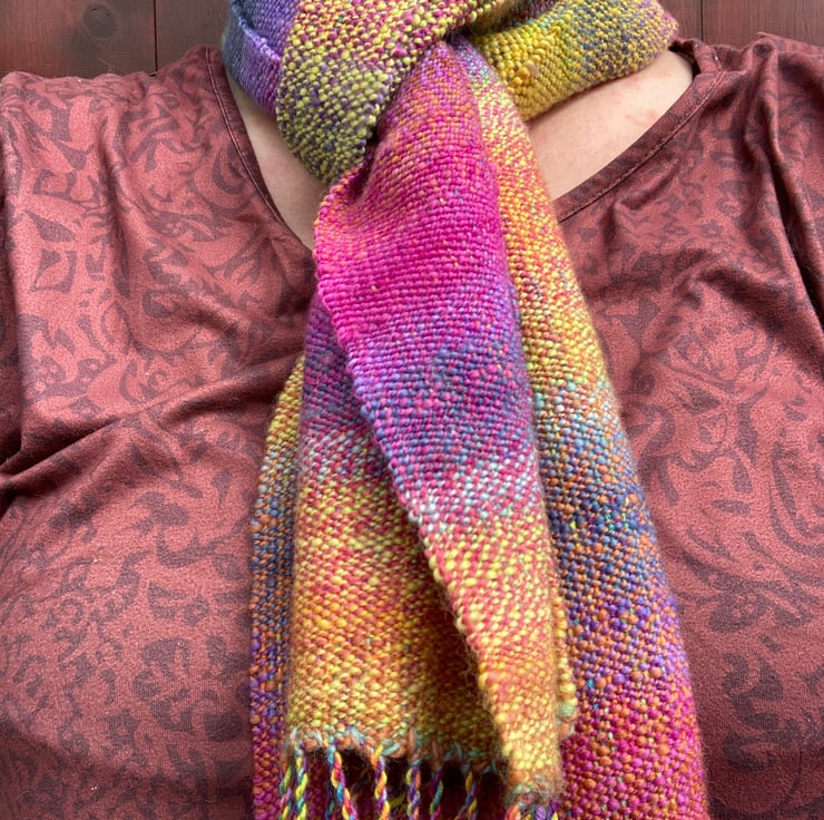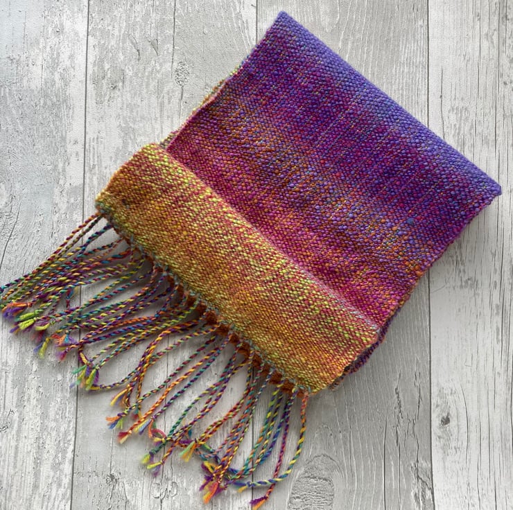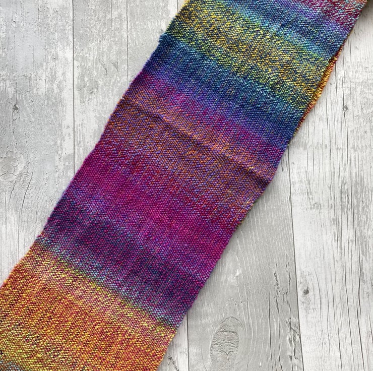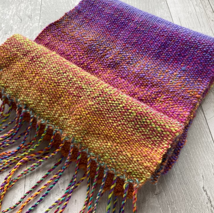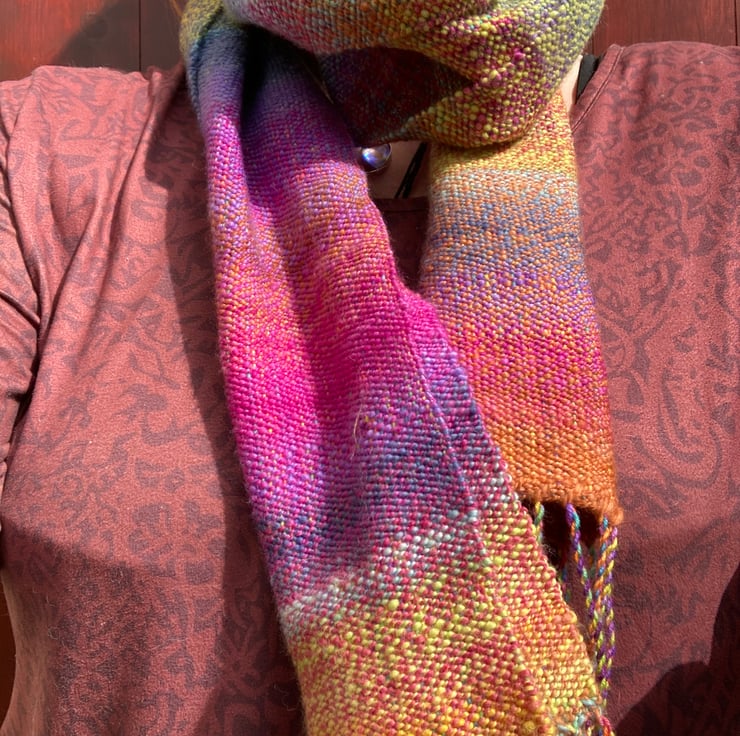 Beautifully soft and drapey Polwarth scarf. I dyed the fibre first and then hand spun on my spinning wheel into yarn and finally wove it on my rigid heddle loom.