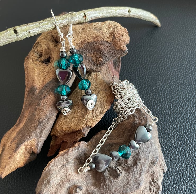 Beautiful Hematite and Teal Crystal Heart Pendant and Earrings