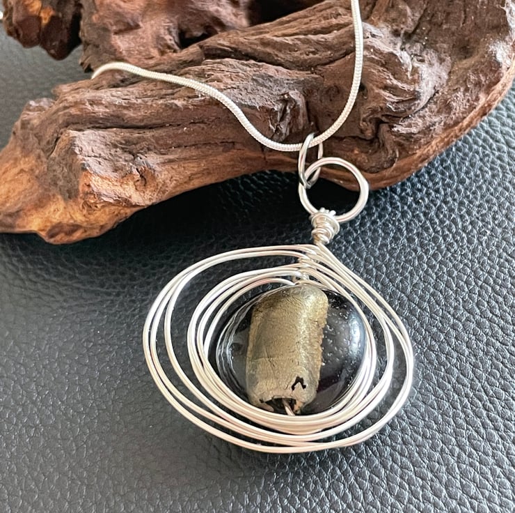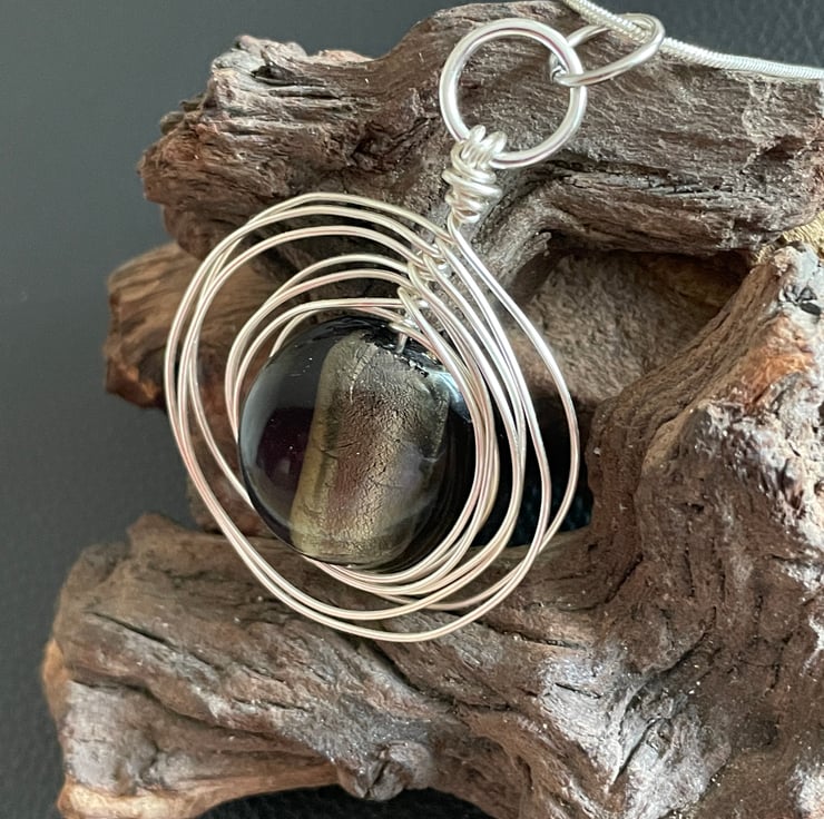 Created using a silver foiled black glass bead, this bold statement pendant was wrapped by hand with silver plated copper artistic wire. This wire has an ultra thin coating that will inhibit tarnishing for longer. Measures approximately 7cm