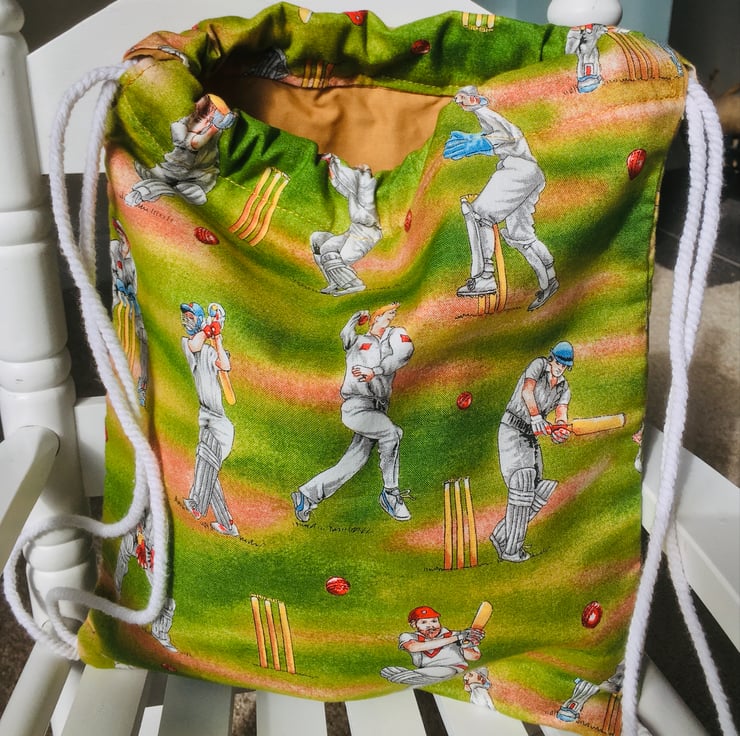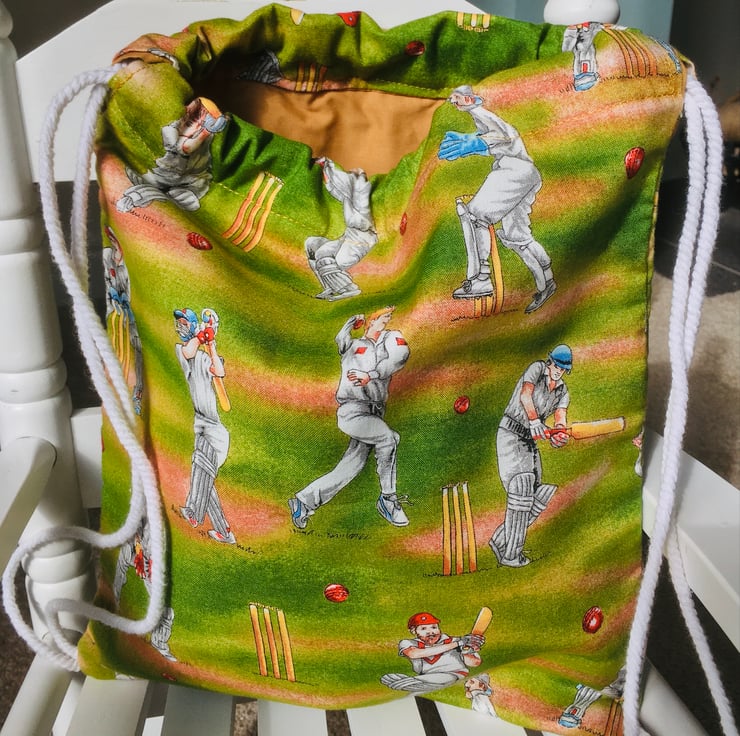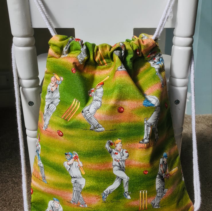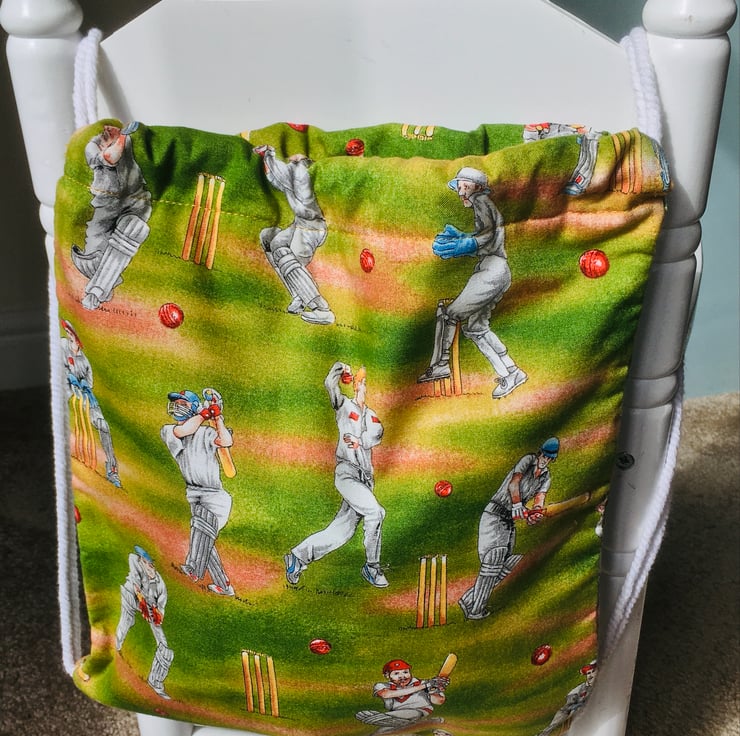 A drawstring backpack featuring cricketers that would be perfect for PE kit or sports kit.