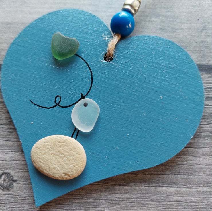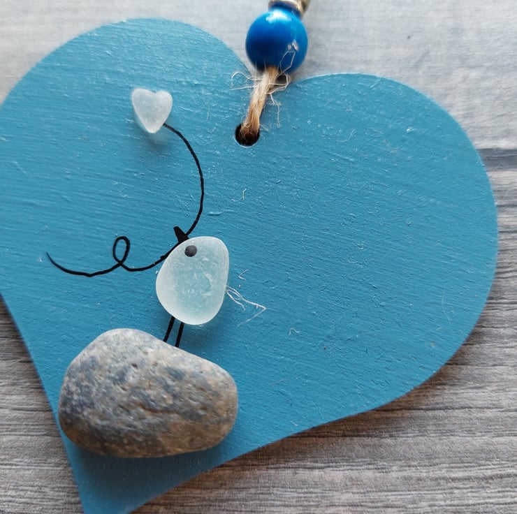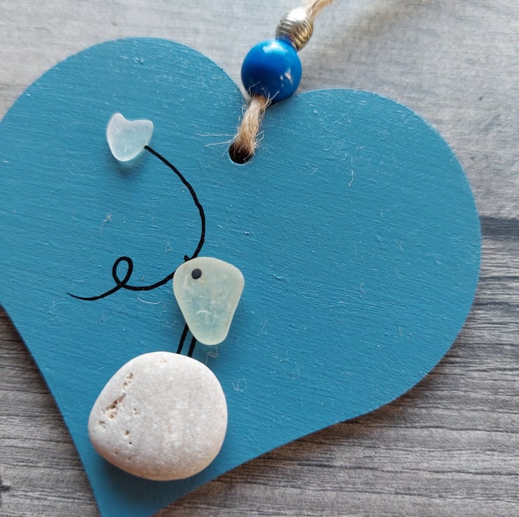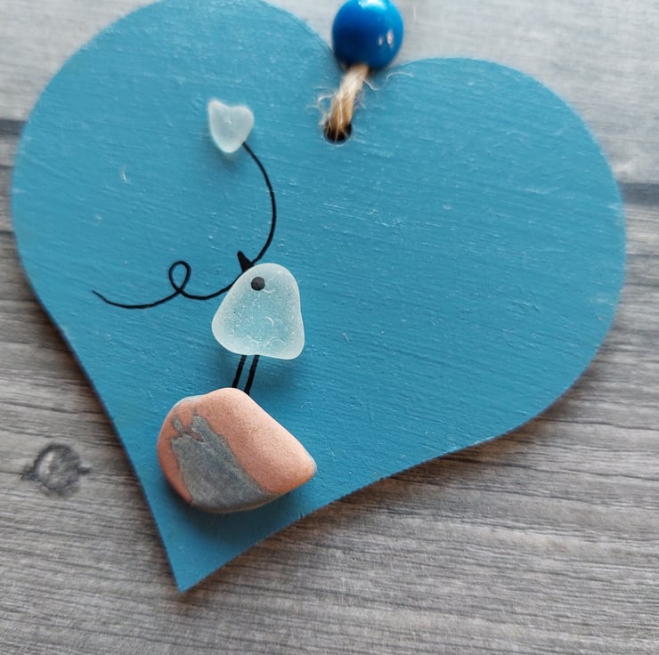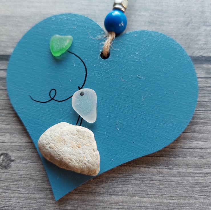 A cute little blue hearts depicting a bird standing on a pebble and holding a heart balloon. This has been made from beautiful natural sea glass collected from Seaham Beach in the North East of England.