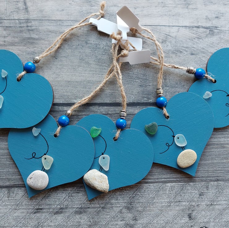 The heart has been hand painted in a sky blue colour and varnished. It has embellished with beads and natural jute twine and measure 8cm x 8cm. The drop from the top of the twine to the bottom of the heart is 16cm.