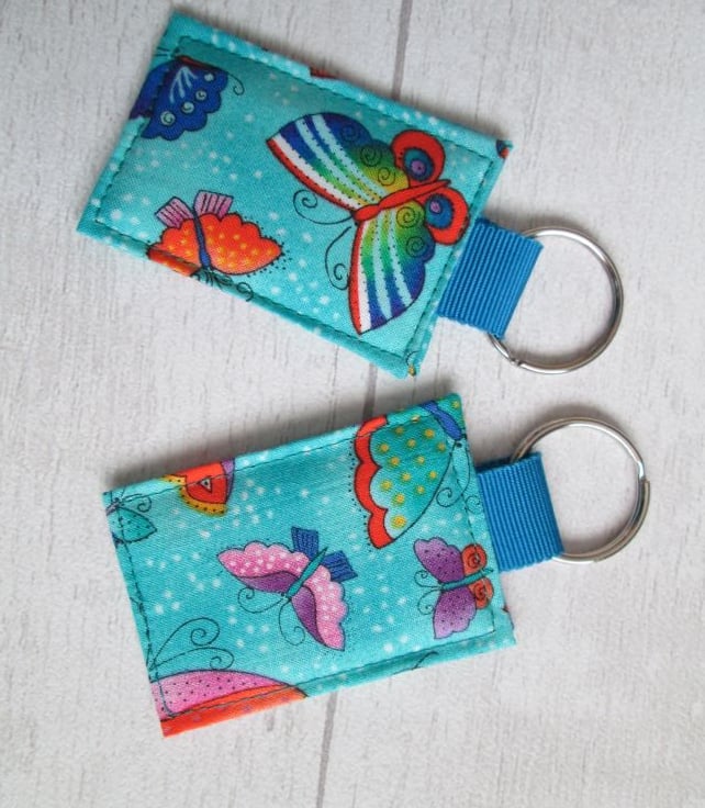 Another pair of handy keyrings or bag tags - this time in a print of colourful butterflies on turquoise. Fitted with 2.5 cm metal split rings to take a selection of keys or to attach the tags to bags or luggage.