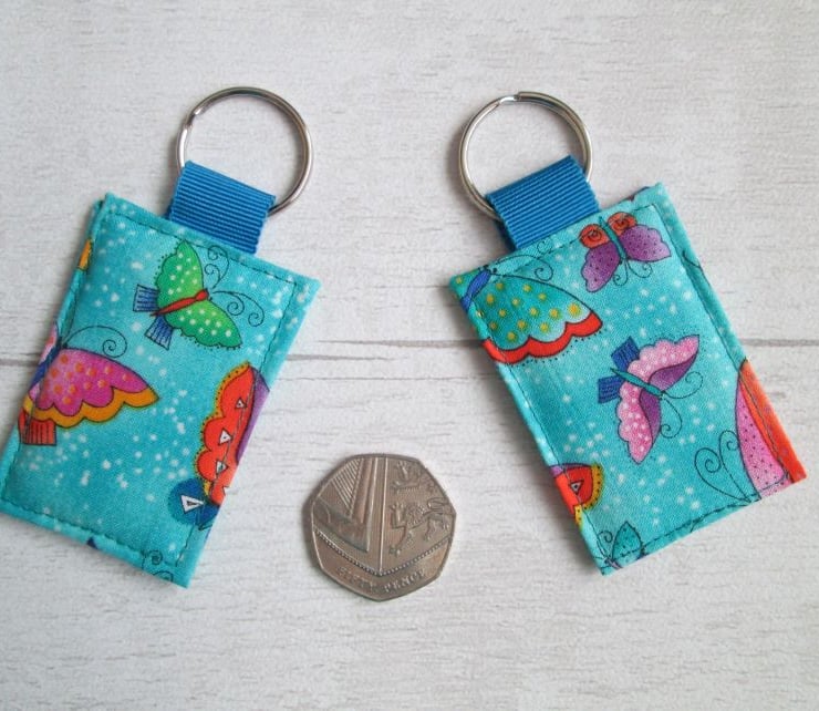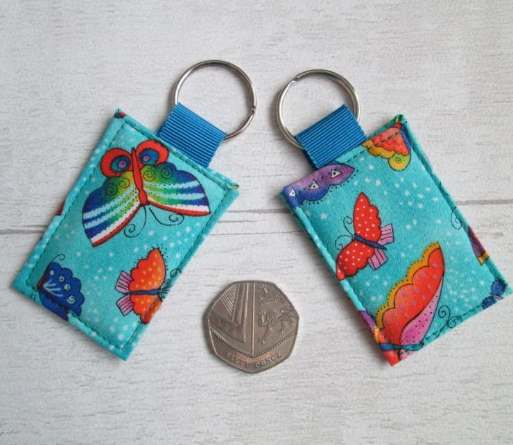 Another pair of handy keyrings or bag tags - this time in a print of colourful butterflies on turquoise. Fitted with 2.5 cm metal split rings to take a selection of keys or to attach the tags to bags or luggage.