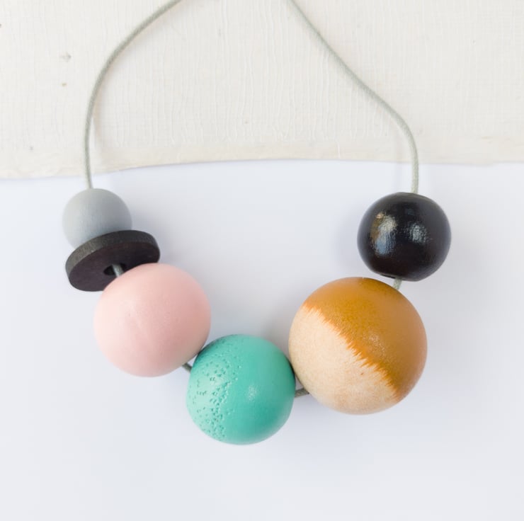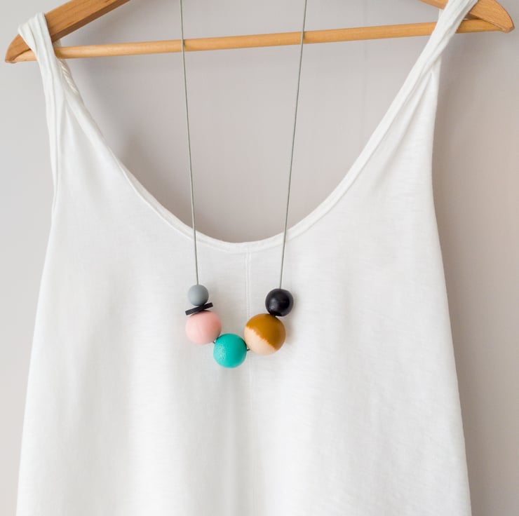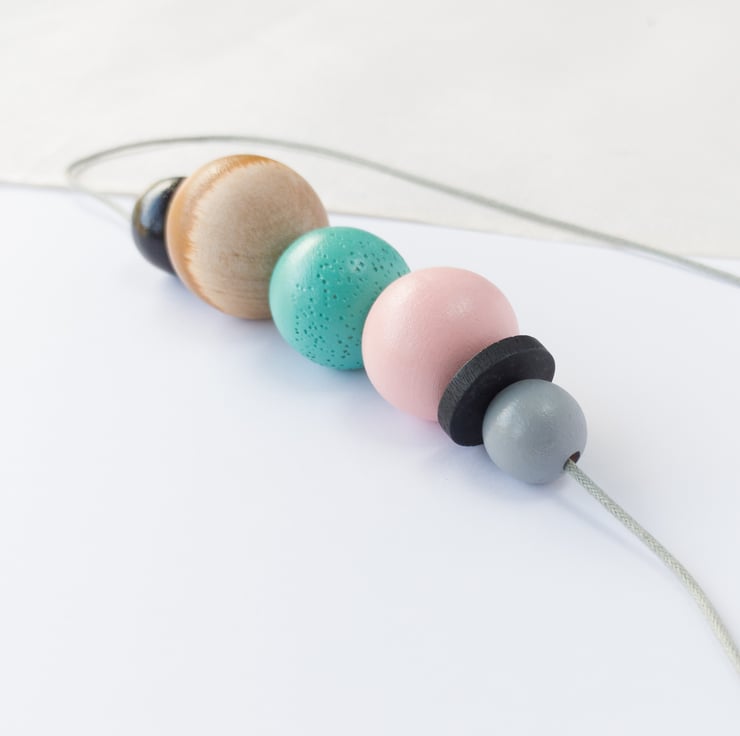 ‘Dixi’ is a lovely summer necklace, goes well with a bright white top. Bubblegum colourway - pale pink, turquoise, black, mustard and grey. The turquoise bead has been textured and painted by hand.