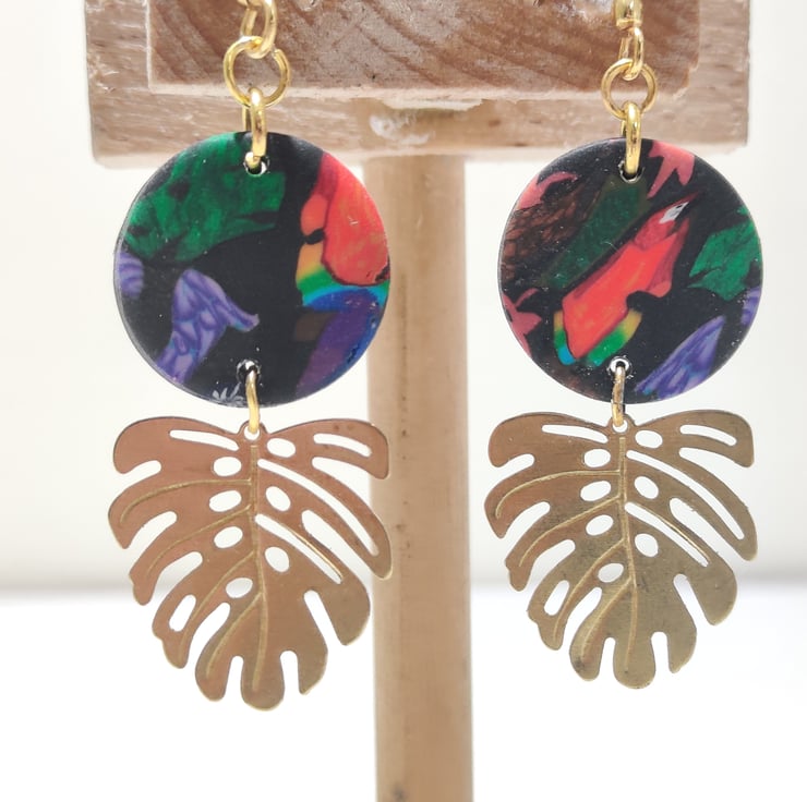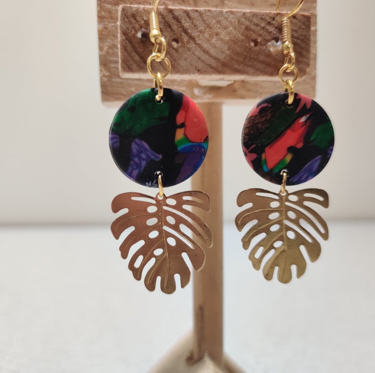 Hand made polymer clay earrings with a jungle pattern and gold colour leaf embellishment. Medium sized. Hook fixing which can be painted with hypoallergenic coating on request for free but may negatively impact the finished look. Please see all photos for close up detail. All products handmade therefore there may be minor imperfections. Each pair sold as seen, message for more