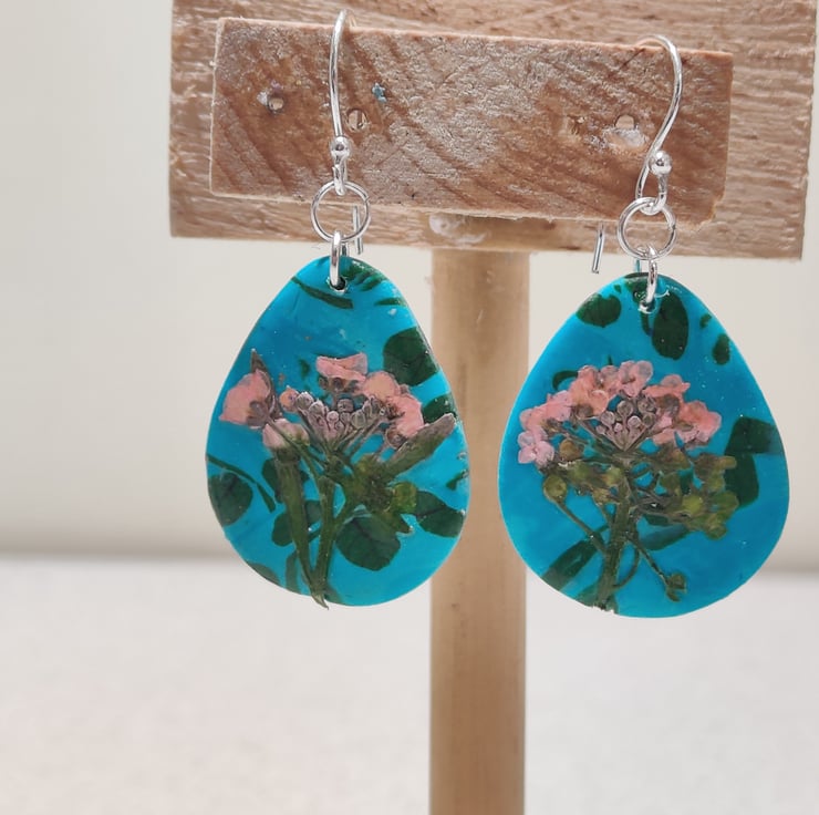 Hand made polymer clay earrings with a leaf clay pattern and dried flowers pressed on and a varnish applied post bake. Hook fixing which can be painted with hypoallergenic coating for free on request. Please see all photos for close up detail. All products handmade therefore there may be minor imperfections. Each pair sold as seen, message for more info