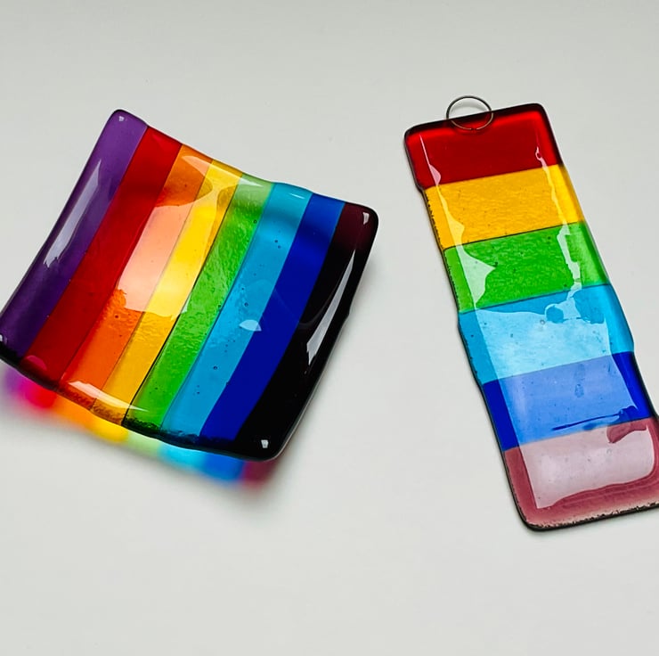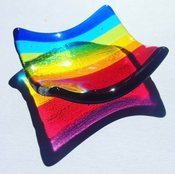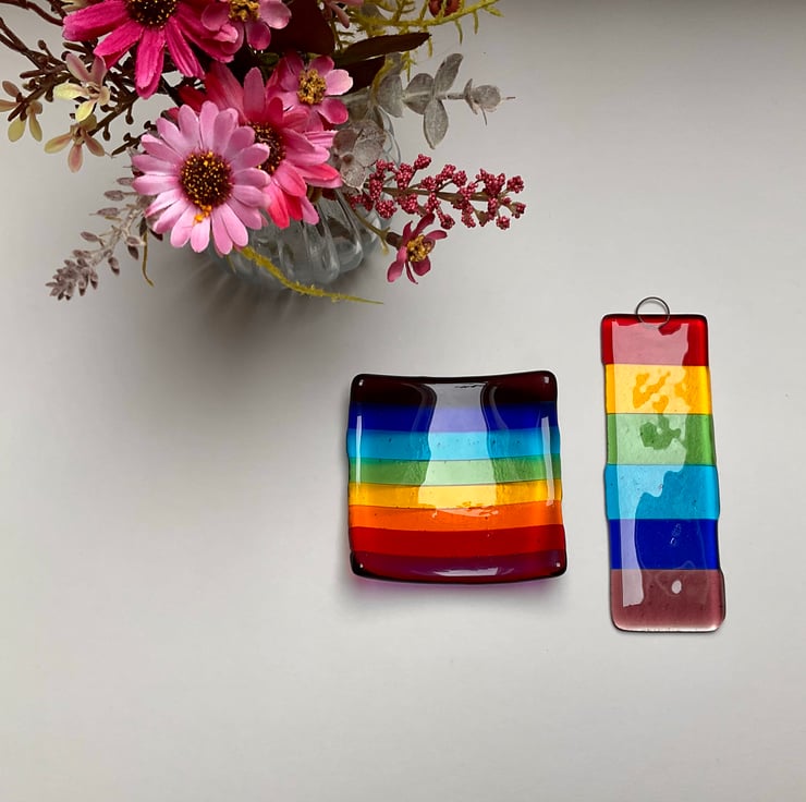 It includes a beautiful handmade fused glass rainbow sun-catcher made from vibrant coloured bullseye glass and a rainbow trinket dish. This set would make an ideal gift for a colour lover and the pieces cast beautiful colourful shadows in the sunlight.