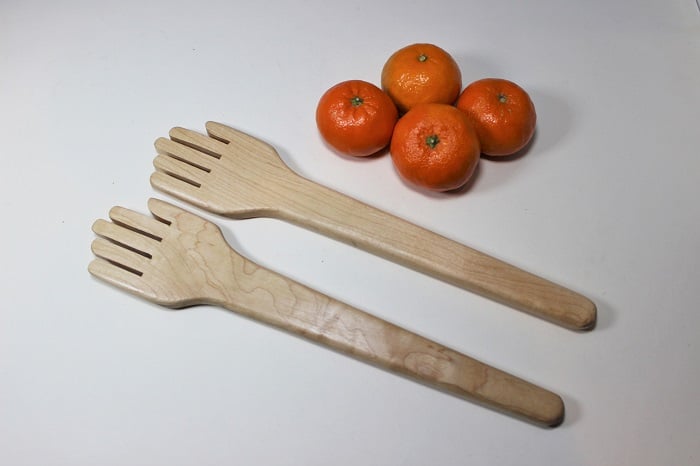 A set of hand shaped serving utensils made out of hard maple wood finished with multiple coats of food safe penetrating oil. The servers are gently tapered toward the heads with all the edges rounded and sanded smooth so they sit comfortable in the hand.