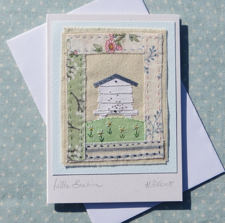 Hand cut miniature applique beehive sitting atop a grassy hill with little yellow flowers, bordered by pretty cotton fabrics. Everything hand-stitched into place with embroidered details including bees! Made with my own hand dyed recycled cotton fabrics.