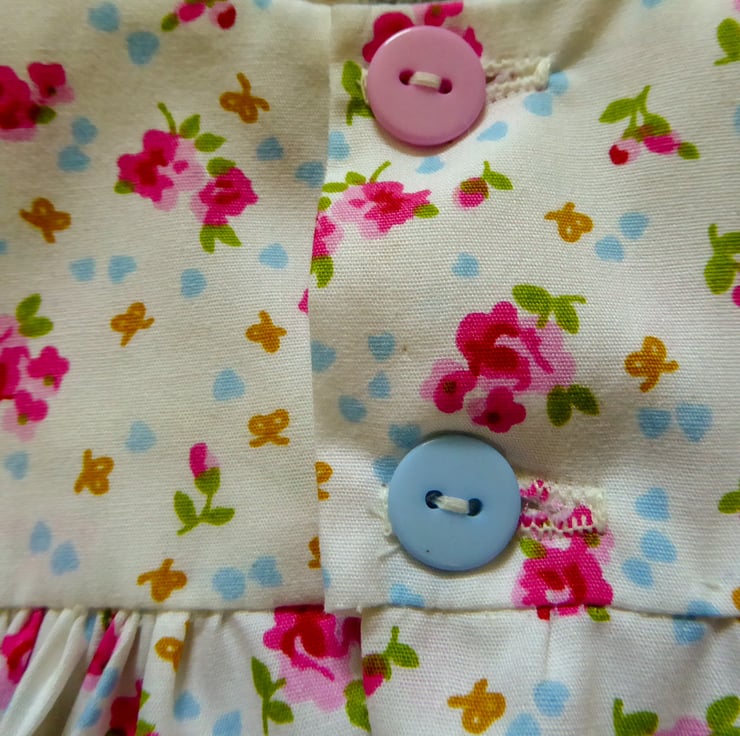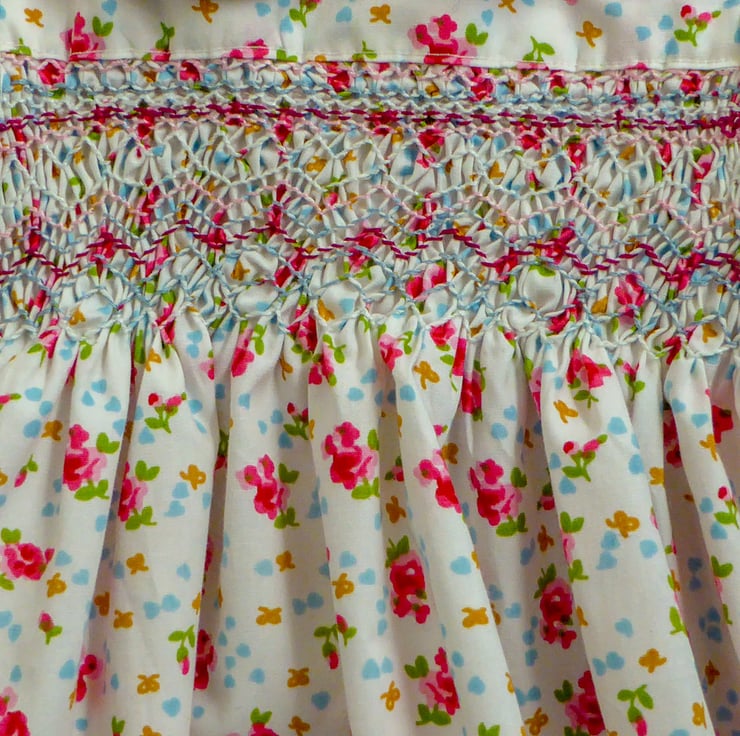 Hand embroidered smocked dress, made in soft cotton poplin. Small pink floral and tiny blue hearts design on white background. Puffed sleeves with elasticated casing.