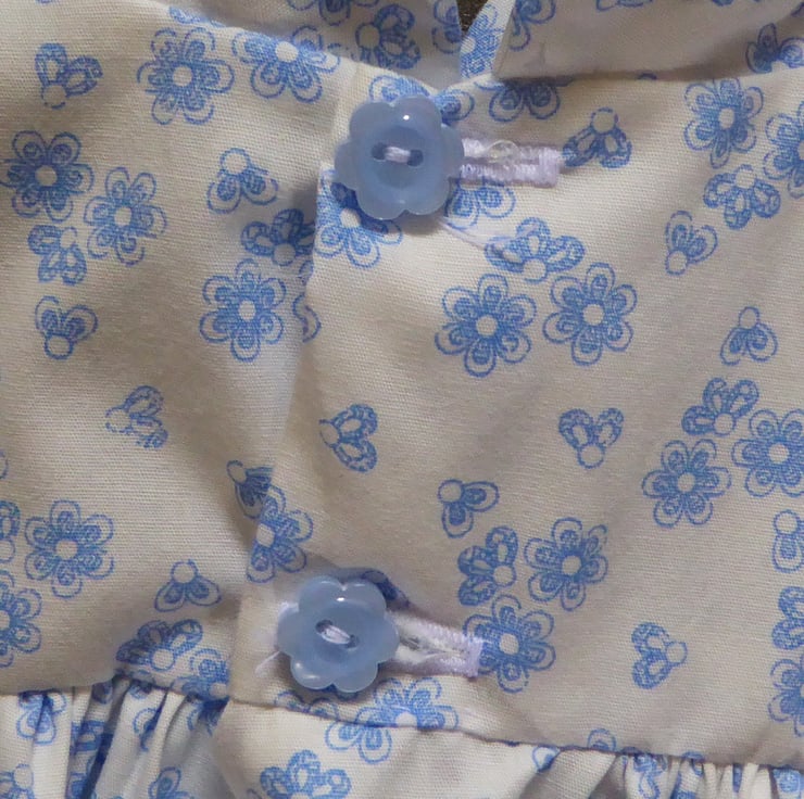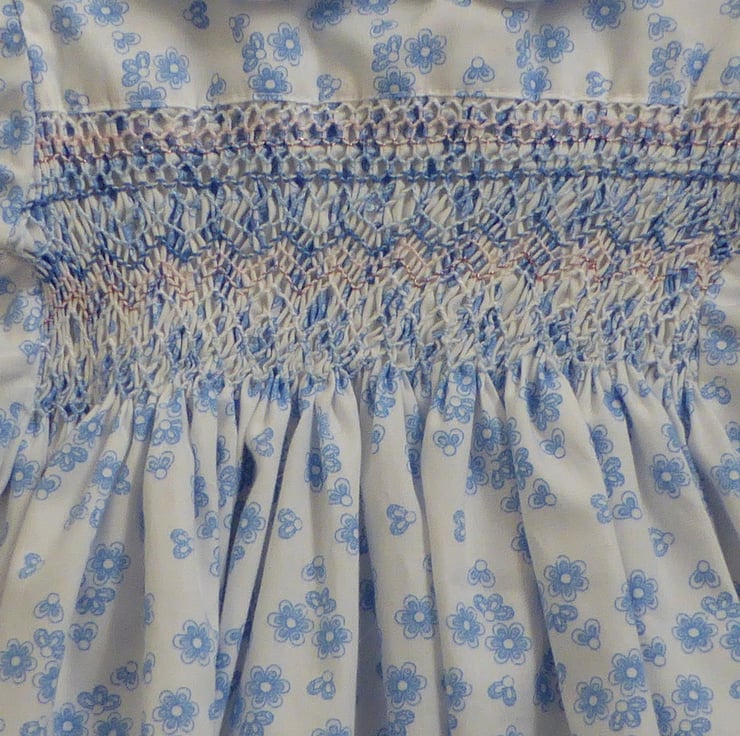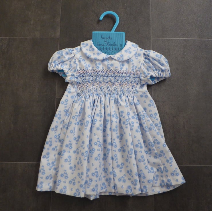 Hand embroidered smocked dress, made in soft cotton poplin. Powder blue flower design on white background. Puffed sleeves with elasticated casing.