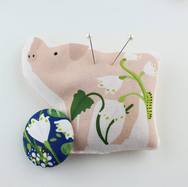 This very cute beanie pin minder is handmade from our fabrics and features a little pig amongst the spring flowers.