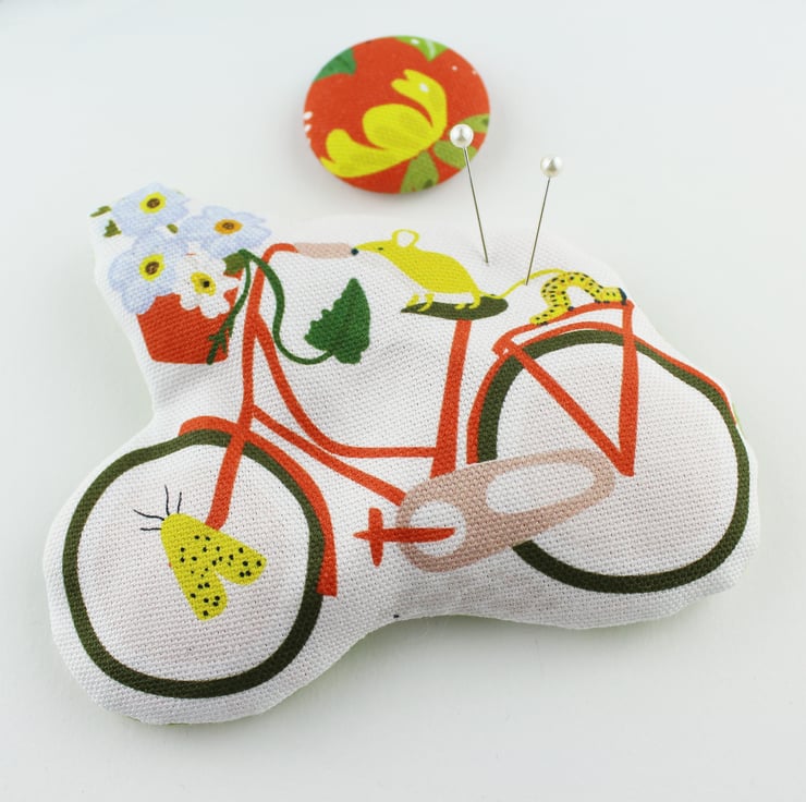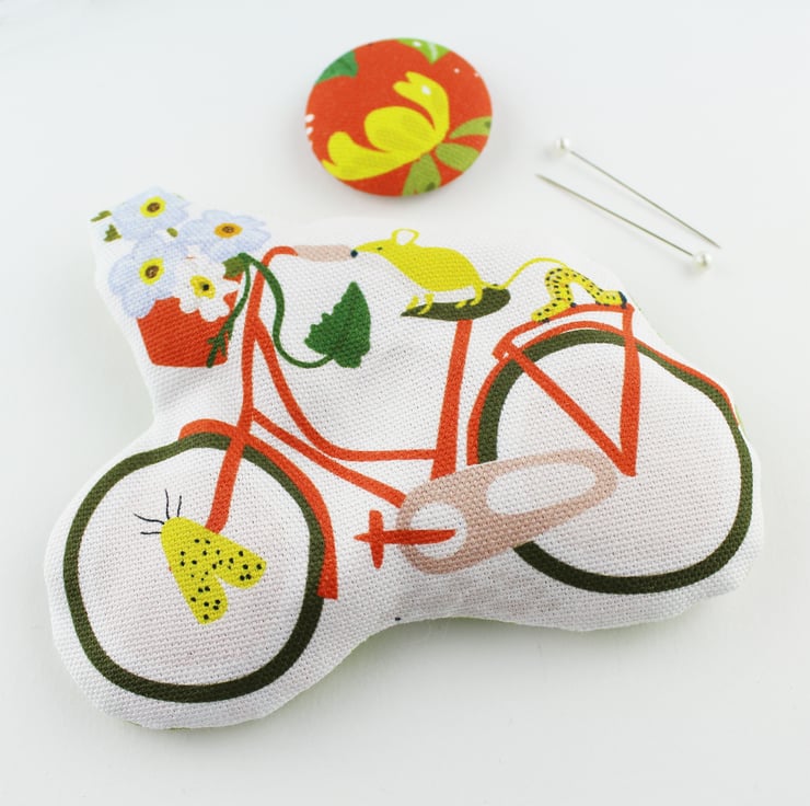 This very cute beanie pin minder is handmade from our fabrics and features a little mouse cycling with spring flowers, a caterpillar and a moth on a bike.