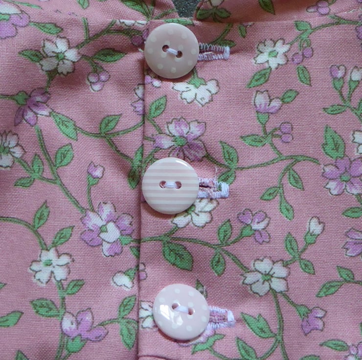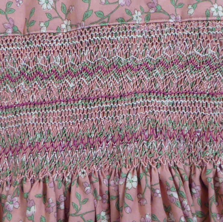 Hand embroidered smocked dress, made in soft cotton poplin. White and lilac flower on green stem design on a pink background. Puffed sleeves with elasticated casing.
