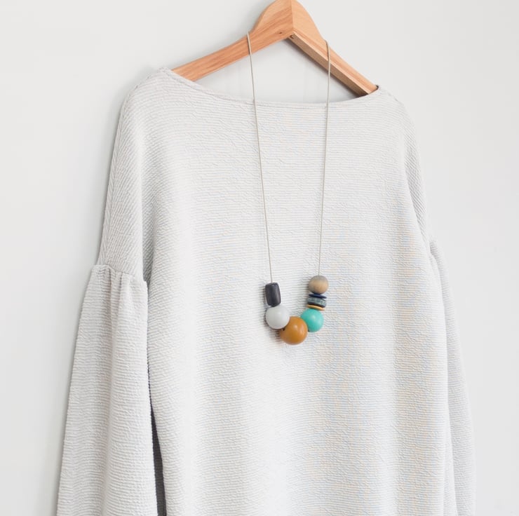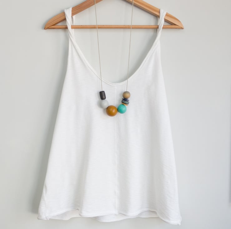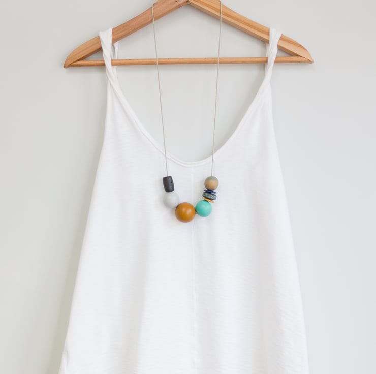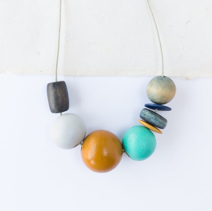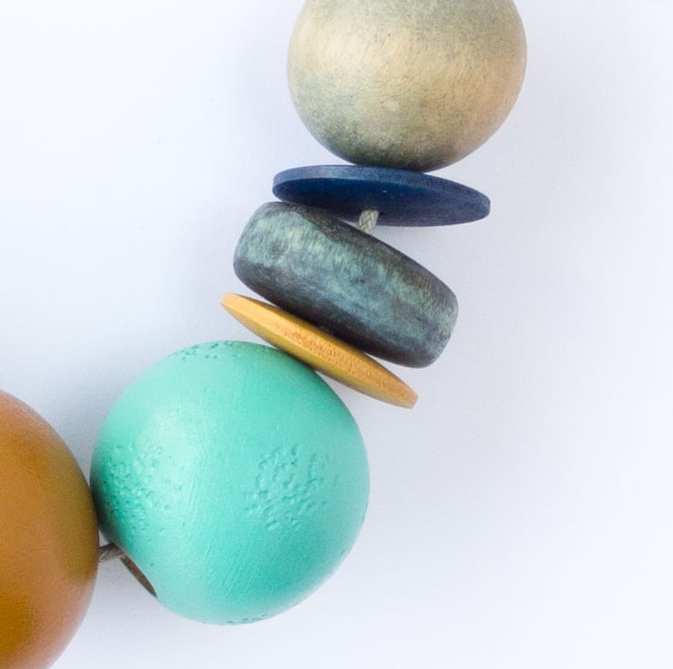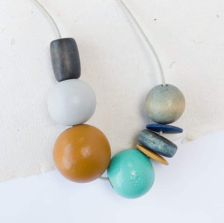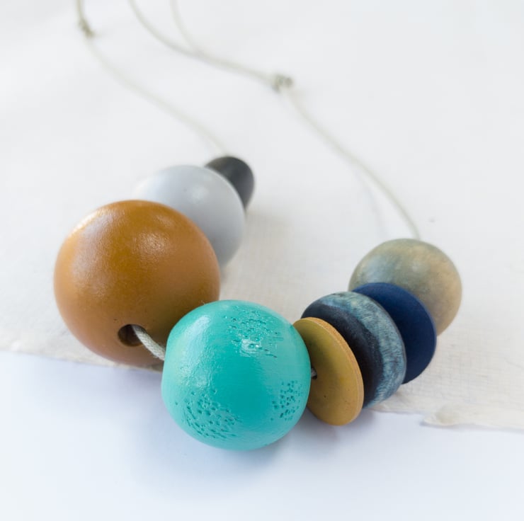 ‘Ginny’ reminds me of lazy days at the seaside; five of the beads have been repurposed, the other three have been hand painted to complement.