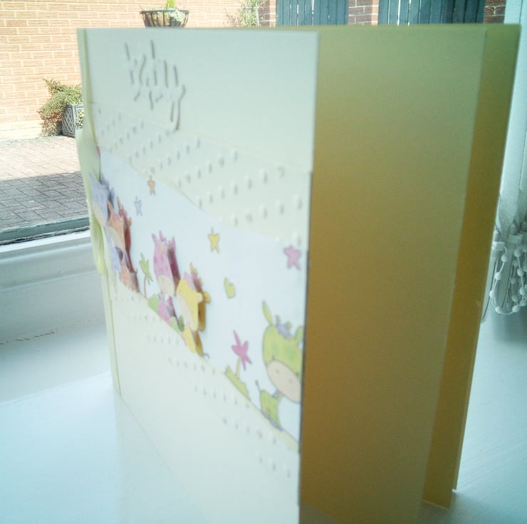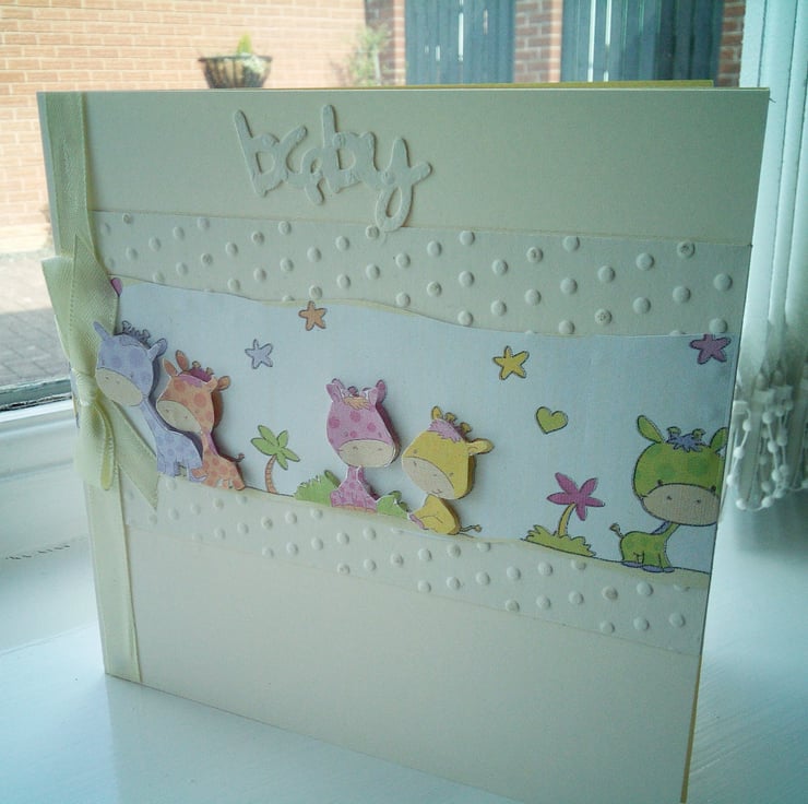 A completely handmade and uniquely designed card. Consisting of a pretty row of baby giraffes decoupage, mounted onto dotty embossed cream card then onto quality cream card. Baby die cut from cream card. Finished off with lemon ribbon and bow