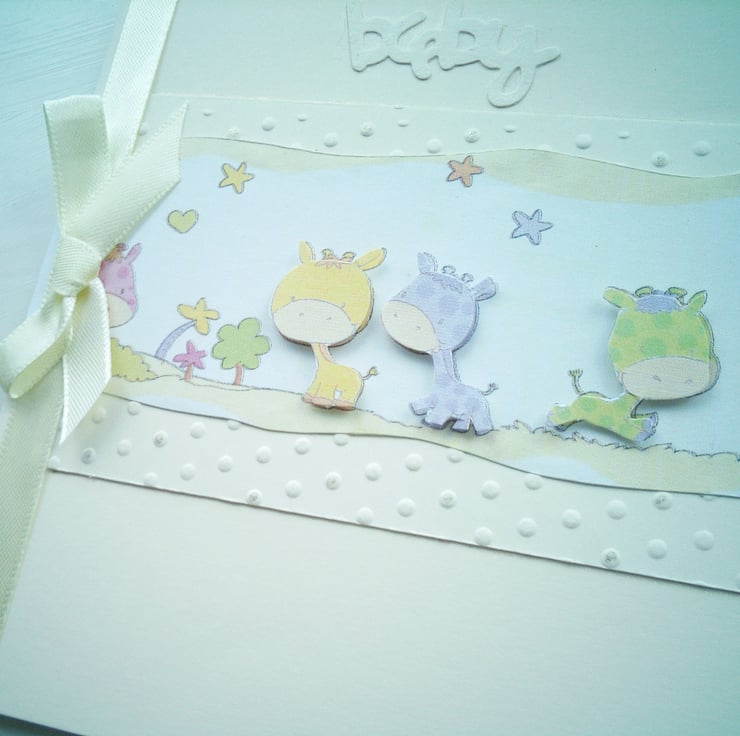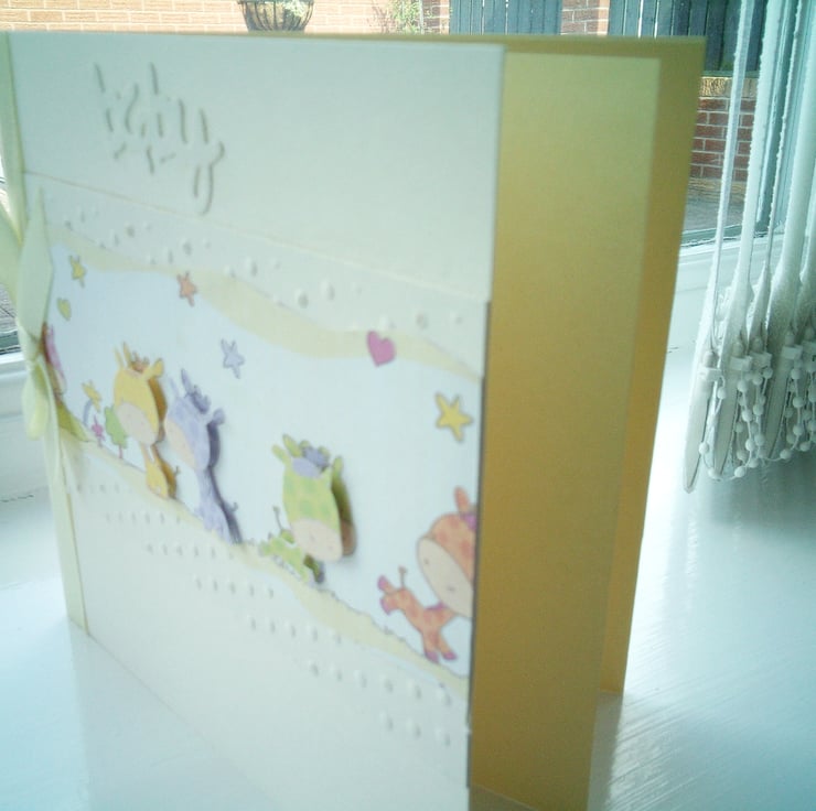A completely handmade and uniquely designed card. Consisting of a brow of baby giraffes decoupage mounted onto cream dotty embossed card then onto quality cream card. Baby die cut from cream card. Finished off with lemon ribbon and bow