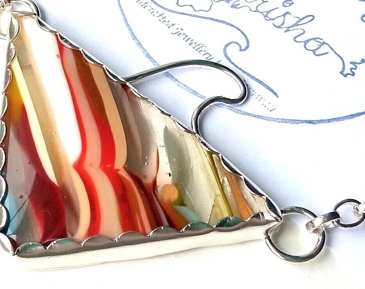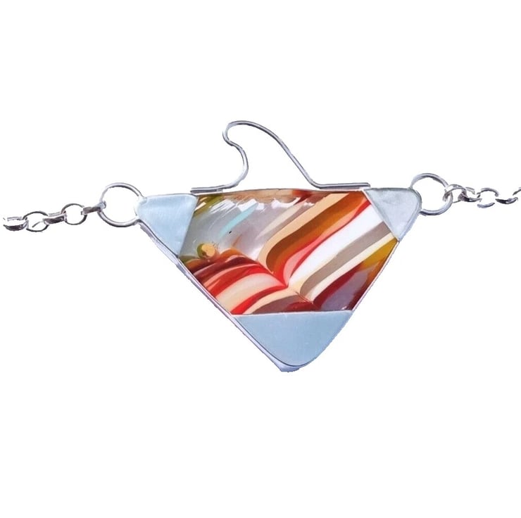 Made from years and years of build-up, this paint has now hardened sufficiently to be cut and polished. Lapidarists slice them up into pieces and shape them so that all the layers of colour can be seen. Jewellery makers then buy these smaller pieces to incorporate them into one-off pieces of jewellery for you!