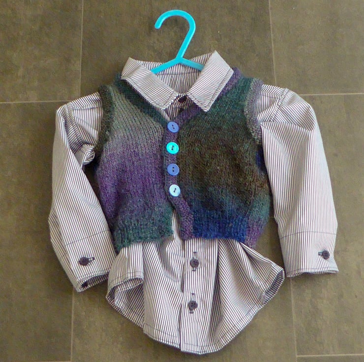 This outfit, in easy care materials and an array of colours was inspired by my young grandson. He loves wearing his with or without the waistcoat.