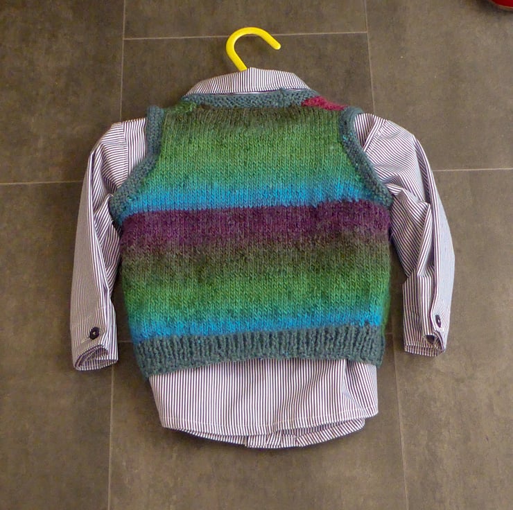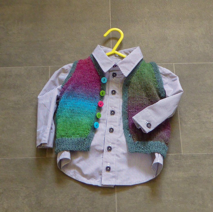 Knitted multicoloured waistcoat body in King Cole Riot yarn 30% wool and 70% acrylic.