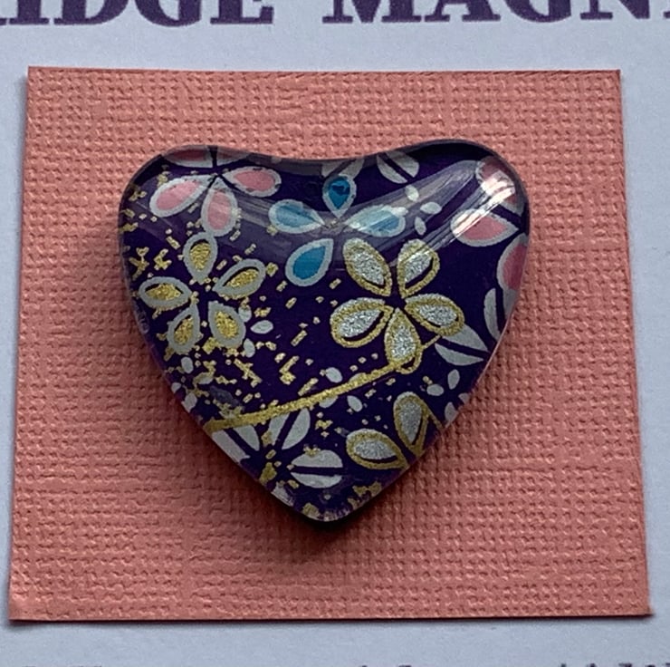 I have created this fridge magnet using gorgeous screen- printed , Japanese yuzen/ chiyogami paper . It has a clear , domed, glass cabochon over the paper which slightly magnifies the images underneath . There is a strong, thin , neodymium magnet on the reverse side .