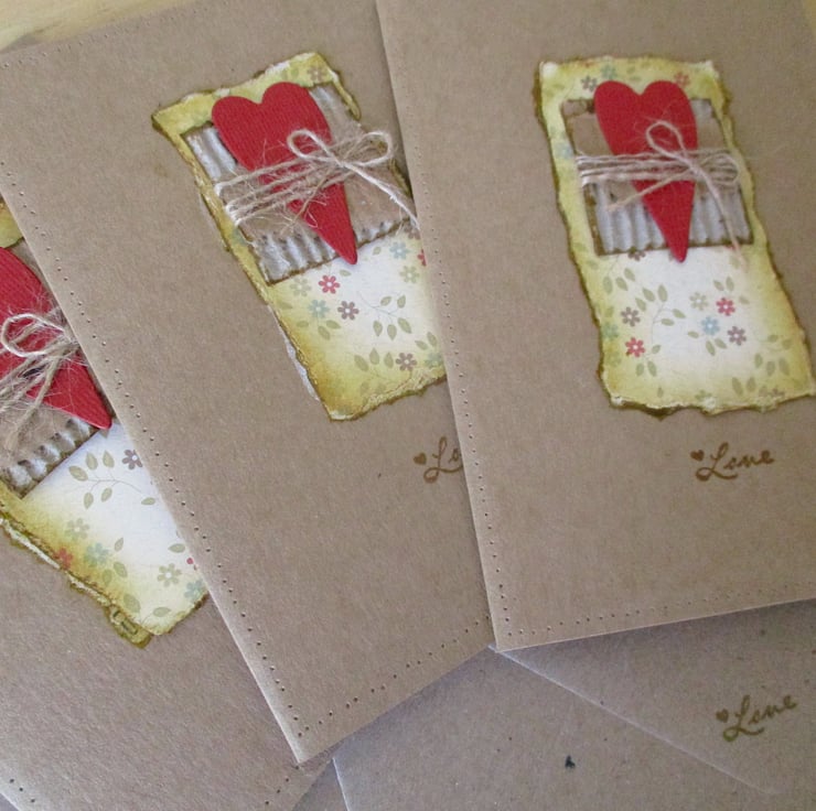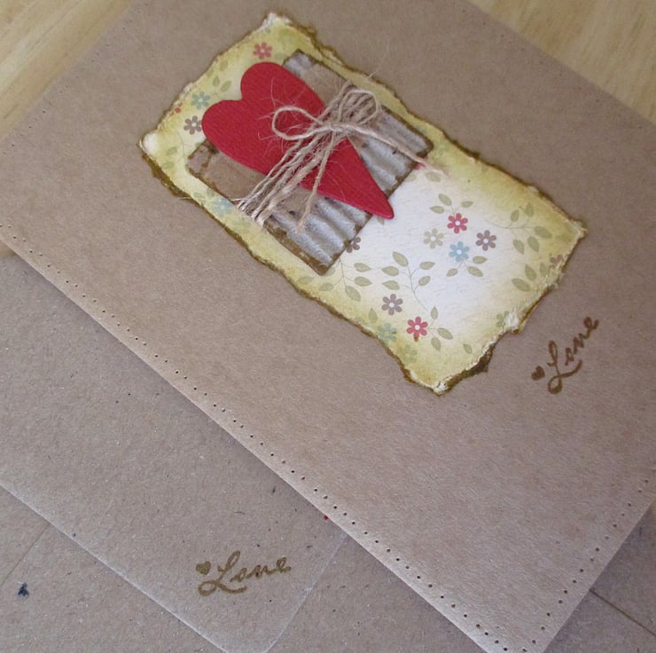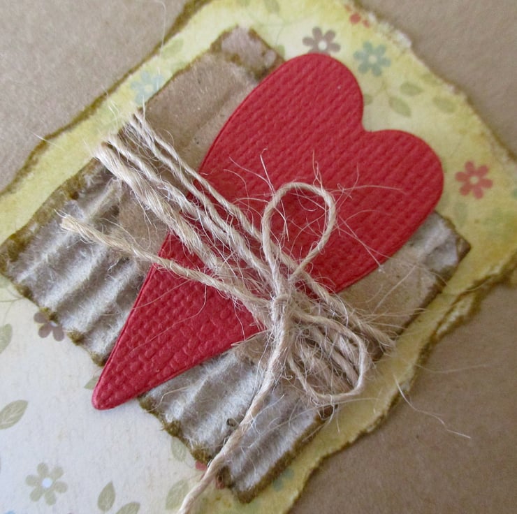 further embellished with inked edge torn corrugated card pieces, a red textured folk heart, wrapped with fine twine and a twine bow.