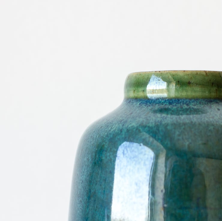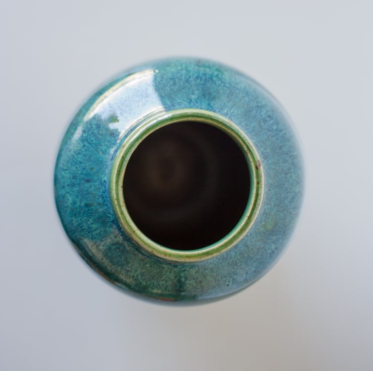 Small vase hand thrown on the pottery wheel and half dip glazed in a rich green blue oribe glaze. The vase has lovely rounded base and shoulder and a collared opening at the top.