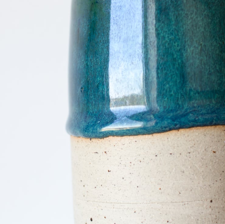 The top half has been dipped in an oribe glaze which once fired results in a deep green blue colour which changes in the light like the iris of an eye. Along the edge of the glaze there is a faint orangey brown band where the clay is toasted by the presence of the glaze. Transparent glaze on the inside allows it to hold water.