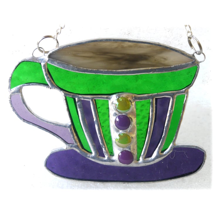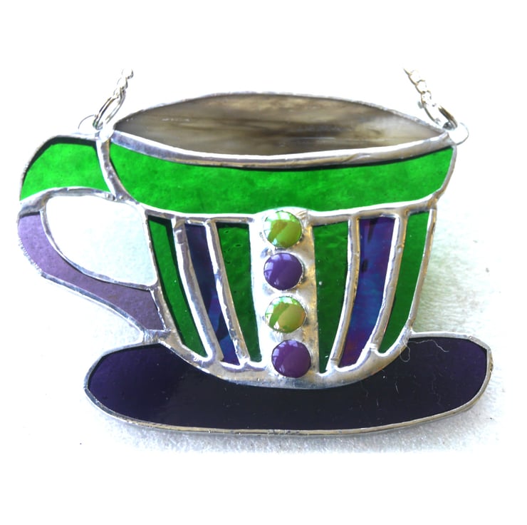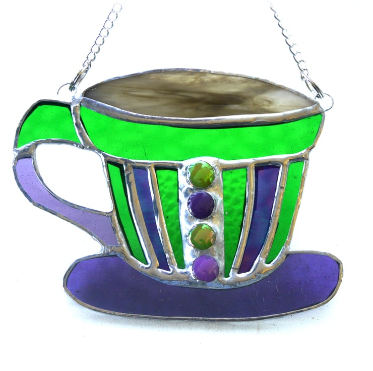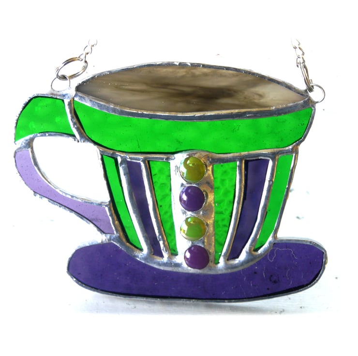 This one is made from shades of bright turquoises and blues and is decorated in the middle of the cup with glass nuggets in matching colours.