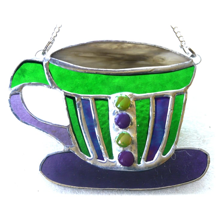 The teacup is 5 inches wide by 4 inches and hangs from a little silvery chain which is securely soldered to either side of the cup.