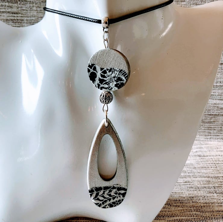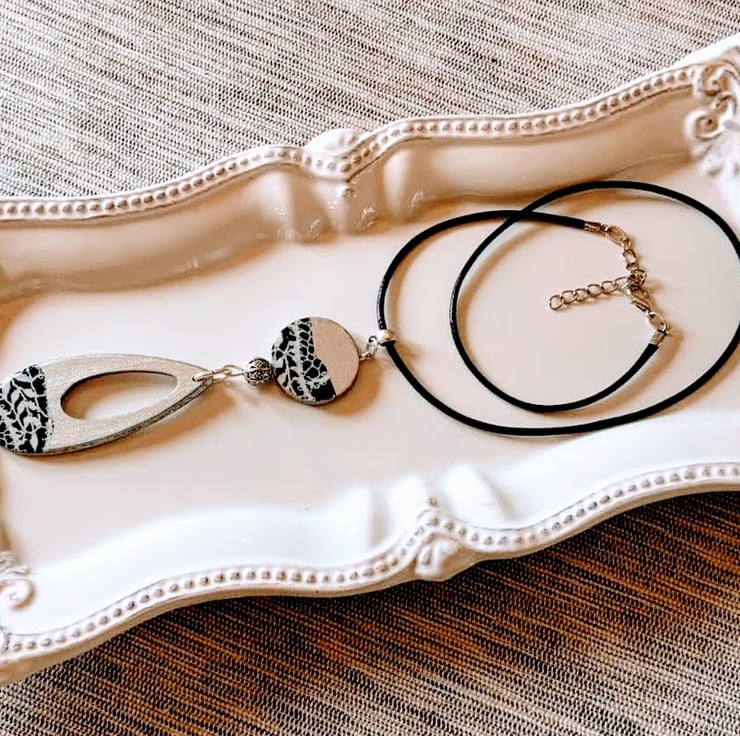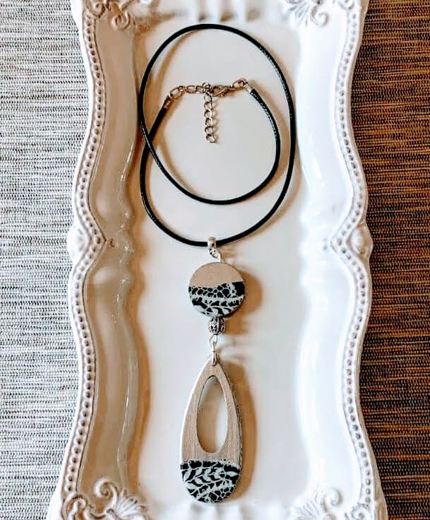 The modern wood pendant design with the delicate vintage lace in black and white.