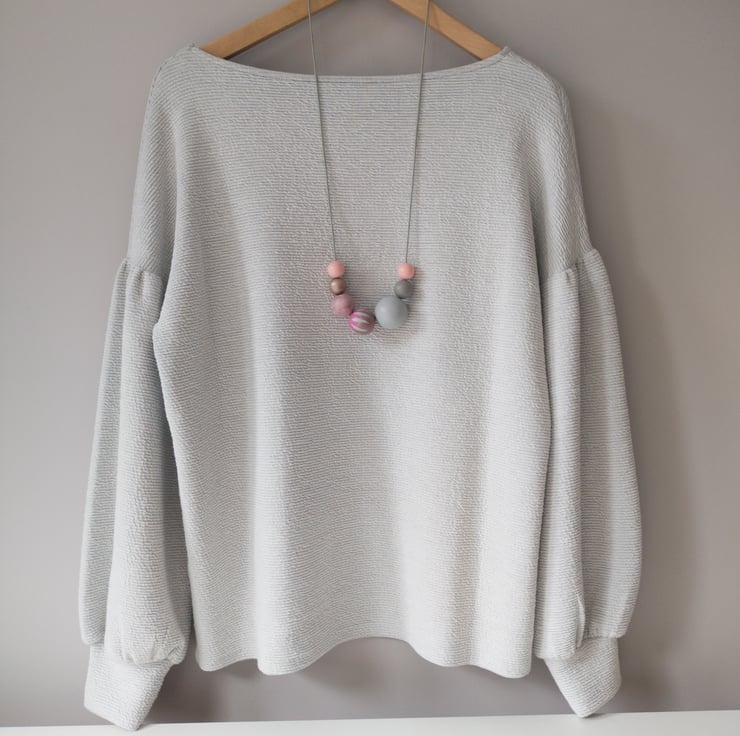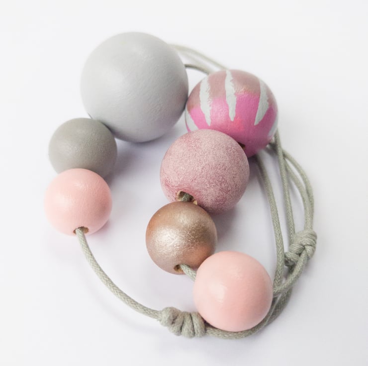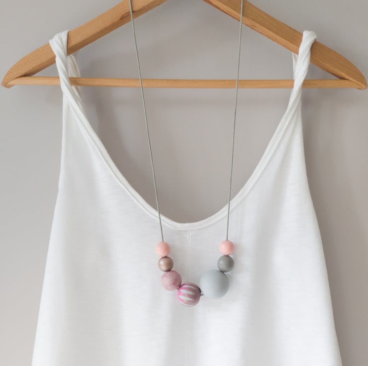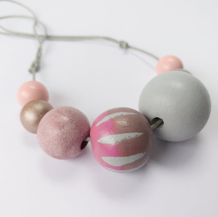 ‘Zoe’ is chunky but subtle - pinks, greys and a little bit of muted gold, make it a great summer necklace and looks lovely with a bright white top. Including one hand painted patterned bead to add a little interest!