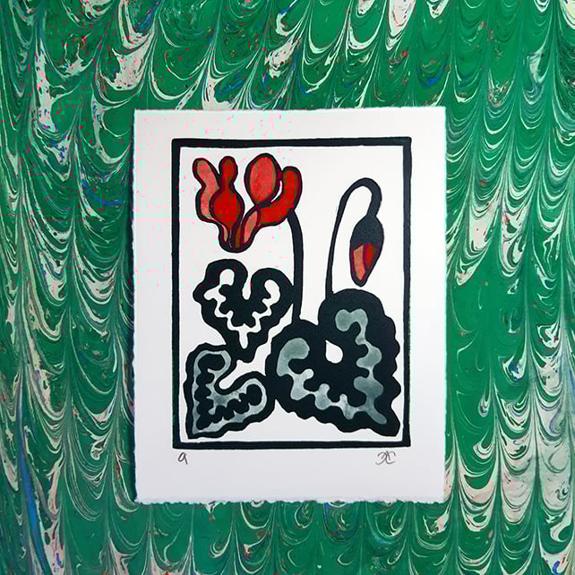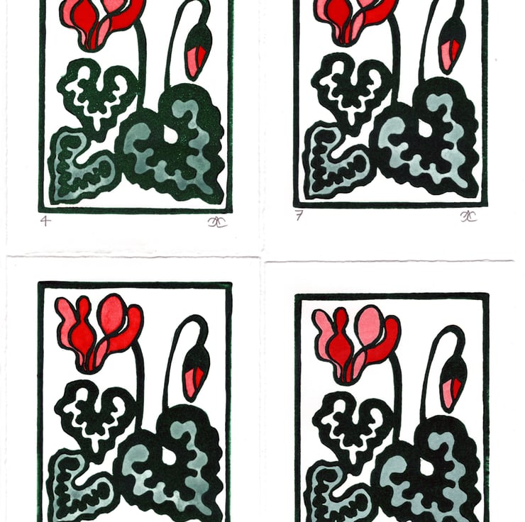 My cyclamen linocut is printed in Cranfield green ink , hand coloured with watercolour on Zerkall printmaking paper.