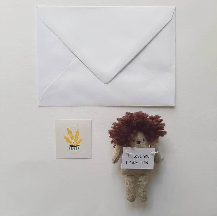 The lion is 10cm tall, including mane, with a note around his neck saying 'I love you, I ain't lion'.