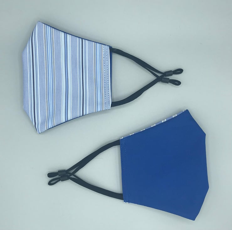 This mask is double-sided with an option of plain navy or copen blue fabric on reverse side. The adjustable toggles allow for greater fit and comfort.