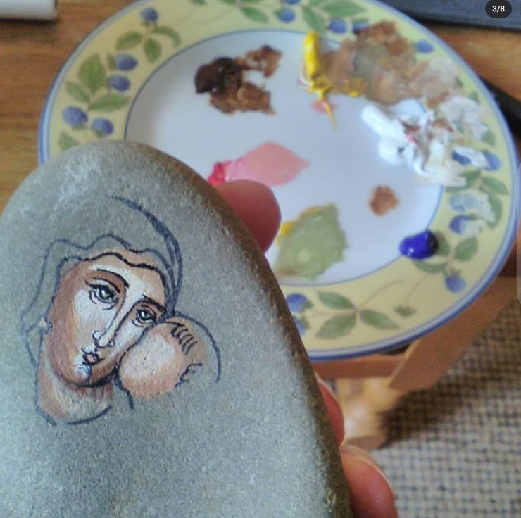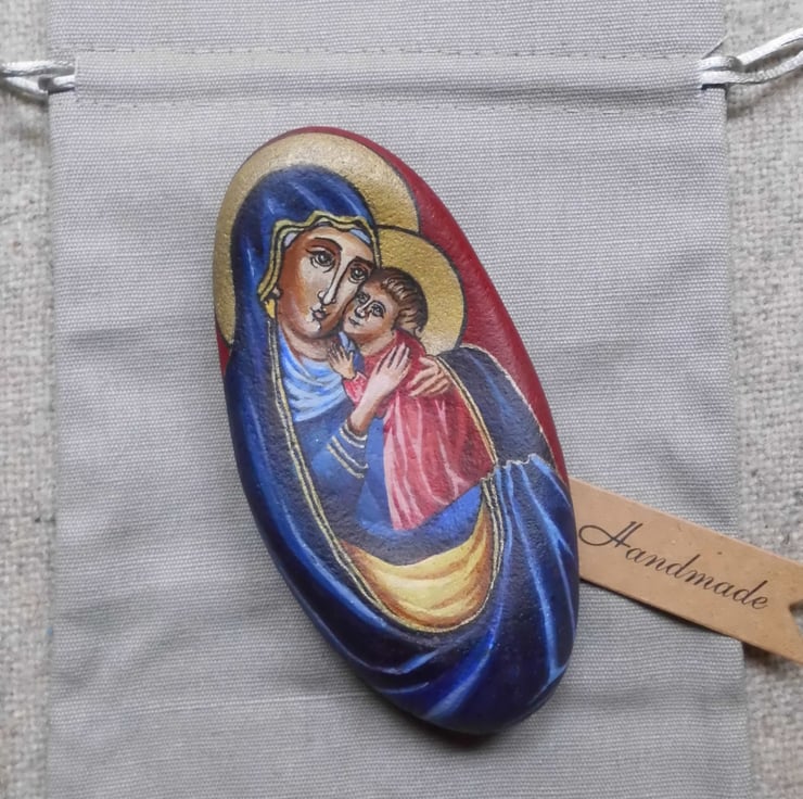 Madonna and Child, painted with acrylics onto a pebble from the seaside.