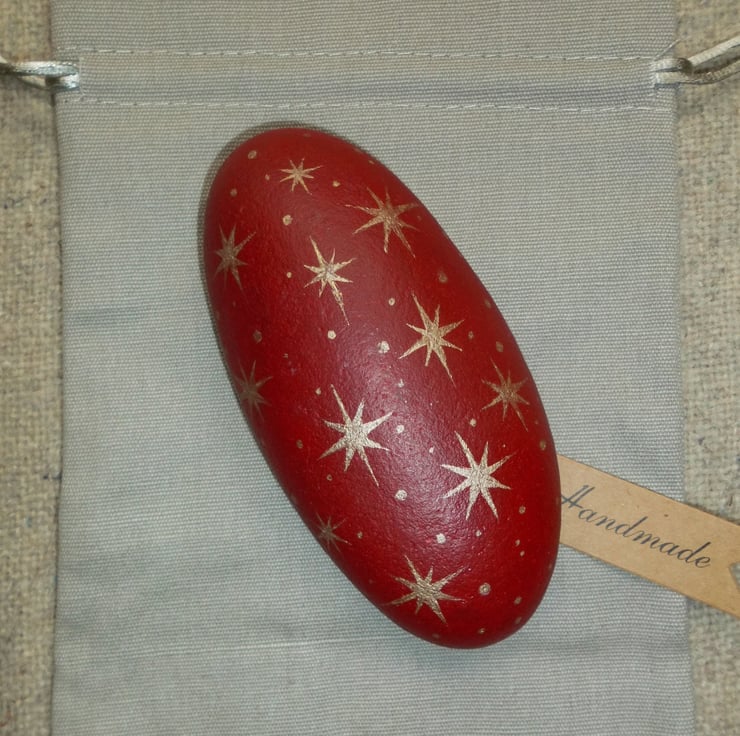 For a short time I started painting pebbles. A good friend brought me some pebbles from her trip to the seaside. As soon as I saw this particular pebble I could see a Madonna and Child painted onto the surface. Because of the size of it, it fits nicely into the palm of the hand but would look beautiful in a carved base of some description, perhaps with a small candle sitting in front. It seemed incomplete without painting the reverse, and I chose a star motif, on a deep red background. After varnishing the pebble, the gold halos turned to an antique gold colour and sit well with the feel of a Russian Icon or early religious painting.
