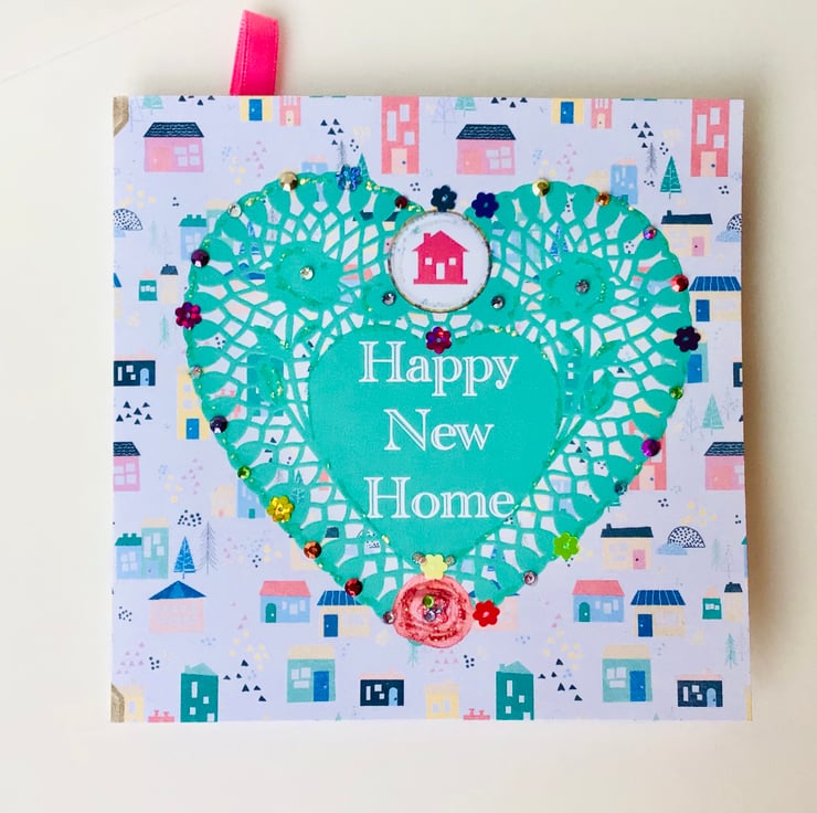 The background print is a house theme ,again in plenty of colours and then the greeting itself is inside a fabric lace, effect printed heart.