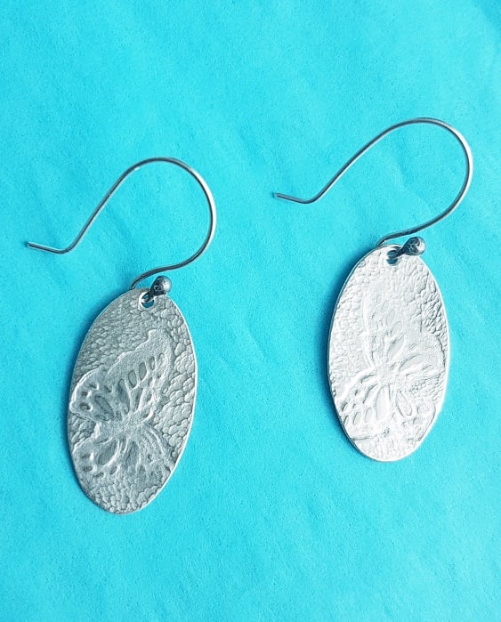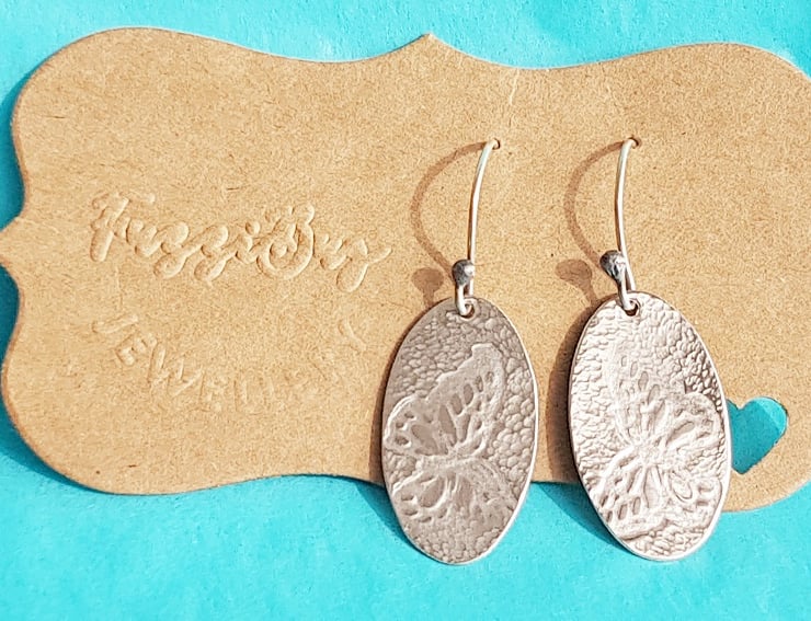 These sterling silver butterfly embossed earrings are hand cut, filed, embossed, textured and polished to a high shine.