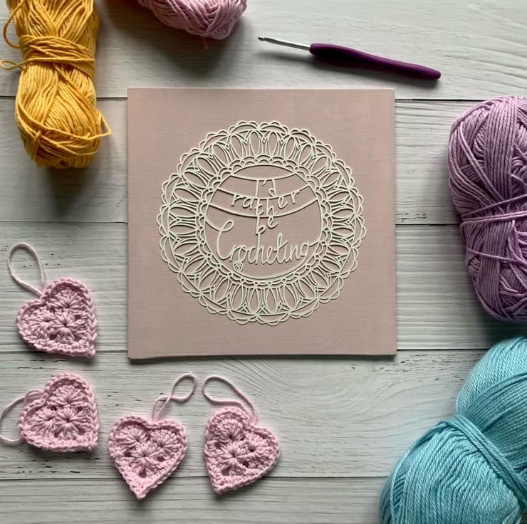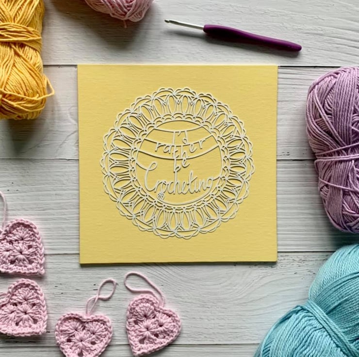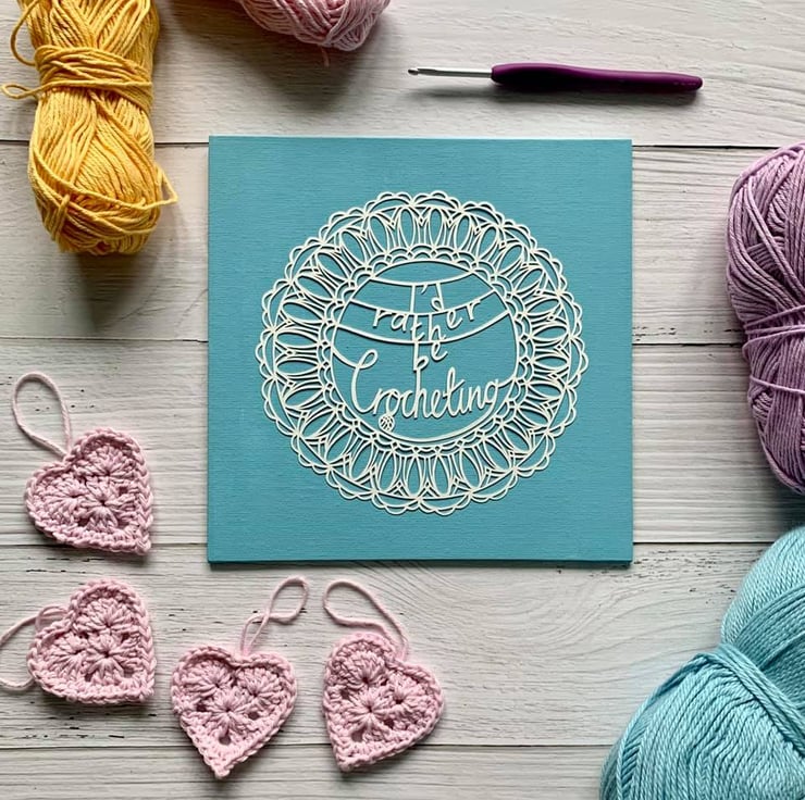 Original papercut 'I'd rather be crocheting', hand cut using a scalpel. Designed and drawn by hand by Gemma Esprey.