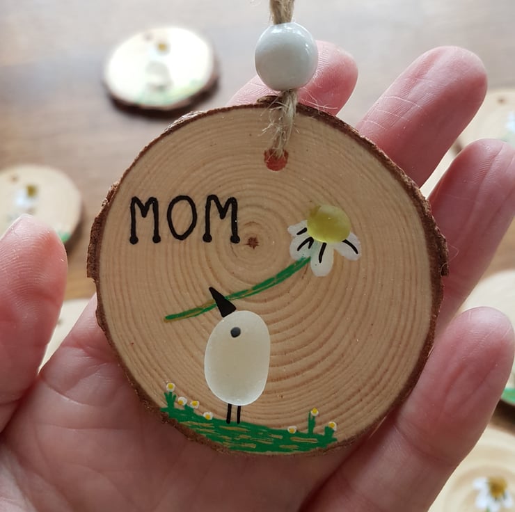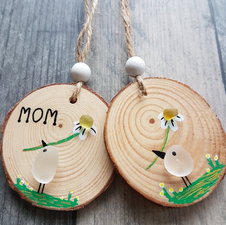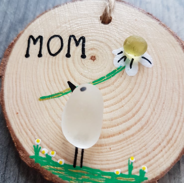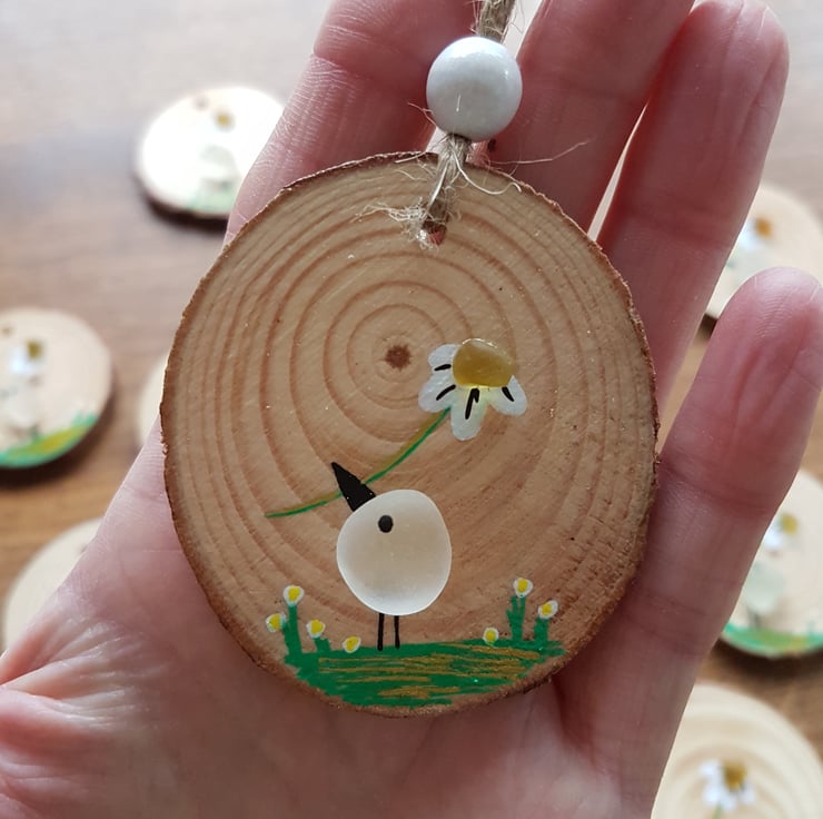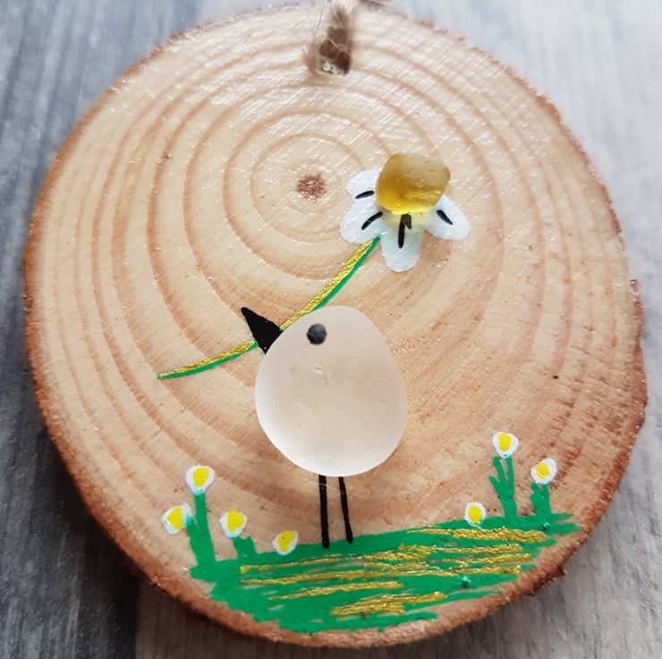 This is a really cute decoration I have made using sea glass on a wood slice. It's a picture of a bird with a daisy flower and features hand painted embellishments. This is cute enough to just hang in your home but it would also make a beautiful and affordable gift for a friend or loved one. The size is approximately 4-5cm in diameter and the drop is 15cm but there will be slight variations as I have used natural product in my designs and individually hand painted each one.
