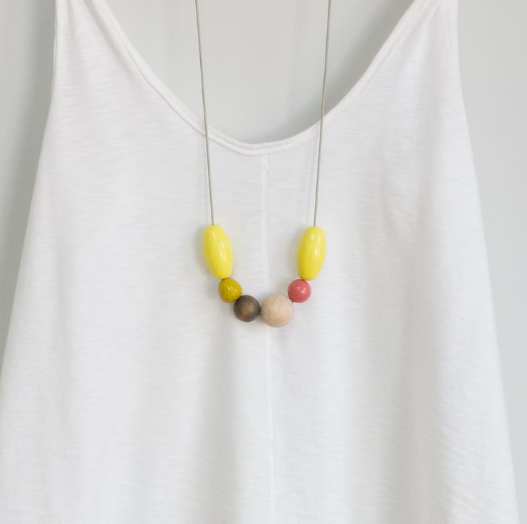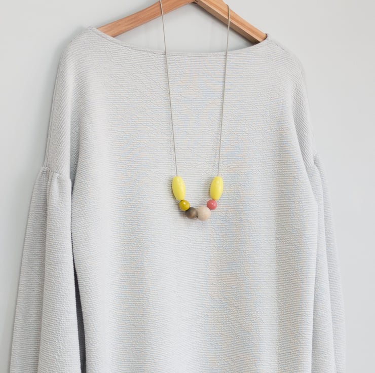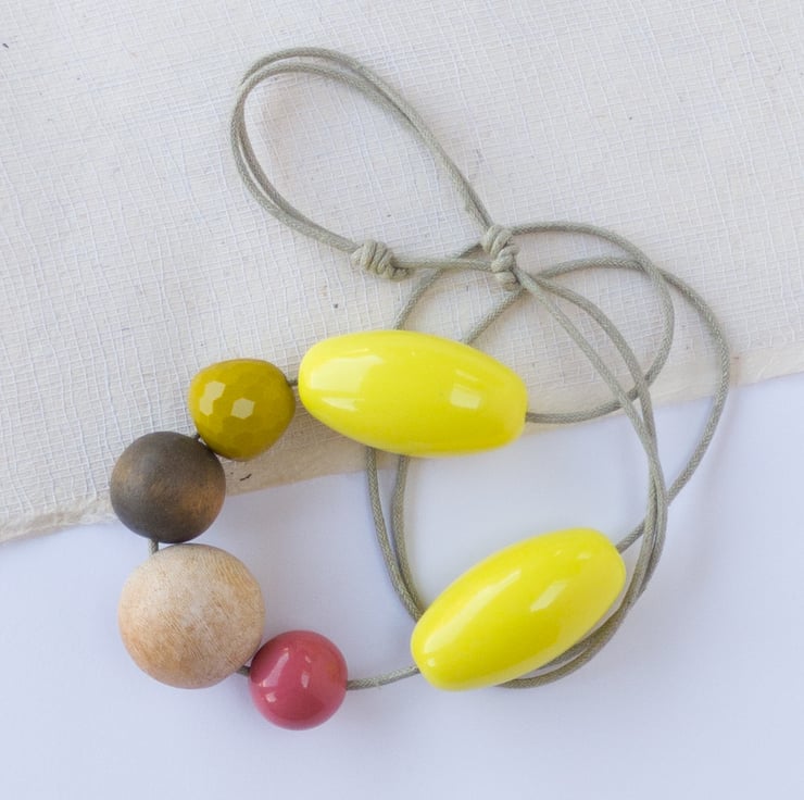 ‘Lilly’ has been designed using six lovely repurposed beads, bright yellow being the dominant colour. A touch of rose pink, mustard, natural and grey-black bring the necklace together. The little mustard bead has a slight texture and lovely sparkle to it. Lilly can easily be made longer or shorter using the adjustable sliding knot.